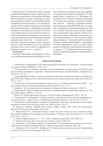 11. Приказчикова Е. Е. Антропологическая утопия Смольного института и её отражение в мемуарно-автобиографической литературе второй половины XVIII века // Вестник Челяб. гос. ун-та. 2009. № 27 (165). С. 105-114.