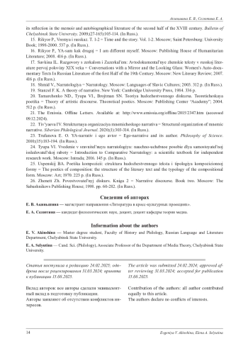 16. Тивьяева И. В. Структурная организация мнемического нарратива // Сибирский филологический журнал. 2020. № 1. С. 303-314. EDN: UWHGDC