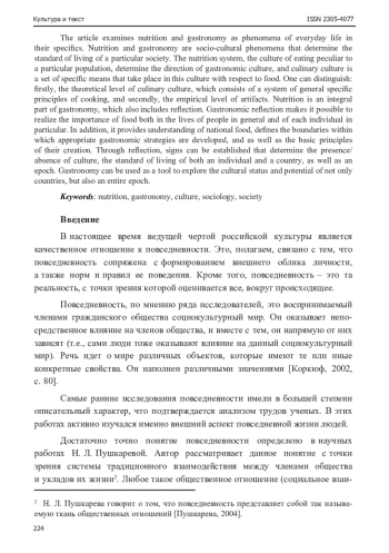 18. Коноплева, Н. А. К вопросу определения сущностных характеристик и факторов формирования повседневной культуры питания и гастрономической культуры / Н. А. Коноплева, М. А. Винокурова // Гуманитарный вектор. - 2019. - Т. 14. - № 4. - С. 143-152. EDN: DEEONZ