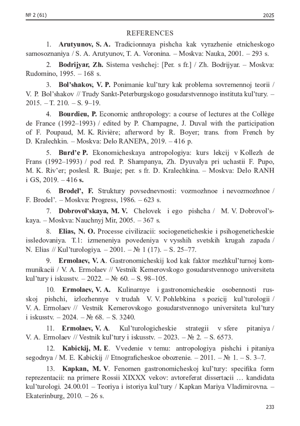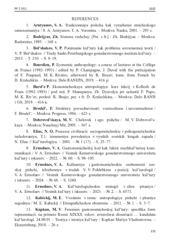 12. Ермолаев, В. А. Кулинарные и гастрономические особенности русской пищи, изложенные в трудах В. В. Похлебкина с позиций культурологии / В. А. Ермолаев // Вестник Кемеровского государственного университета культуры и искусств. - 2024. - № 68. - С. 32-40. EDN: AAVNOY