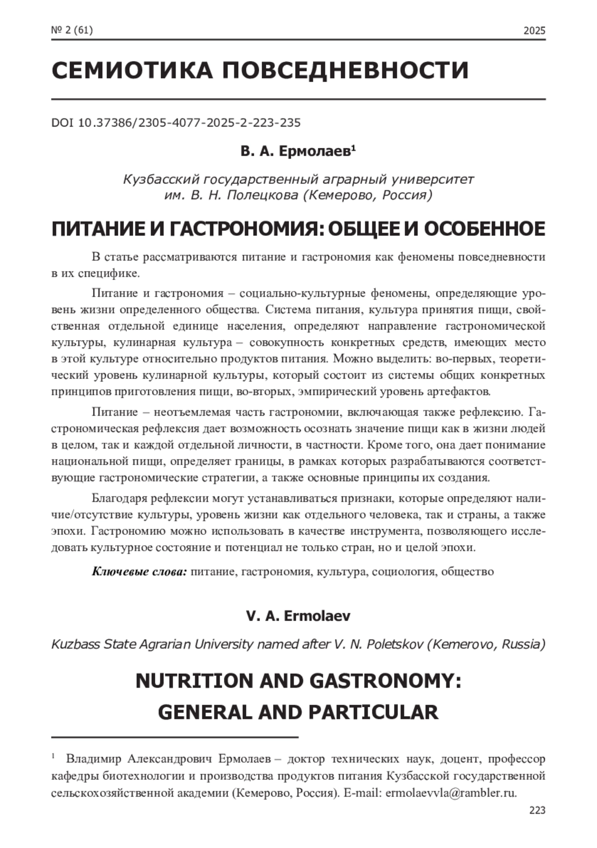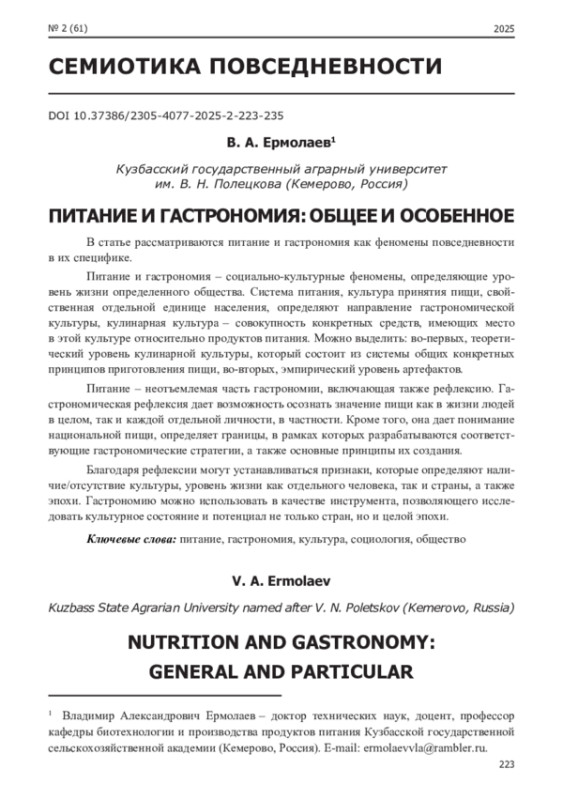 10. Ермолаев, В. А. Культурологические стратегии в сфере питания / В. А. Ермолаев // Вестник культуры и искусств. - 2023. - № 2. - С. 65-73.