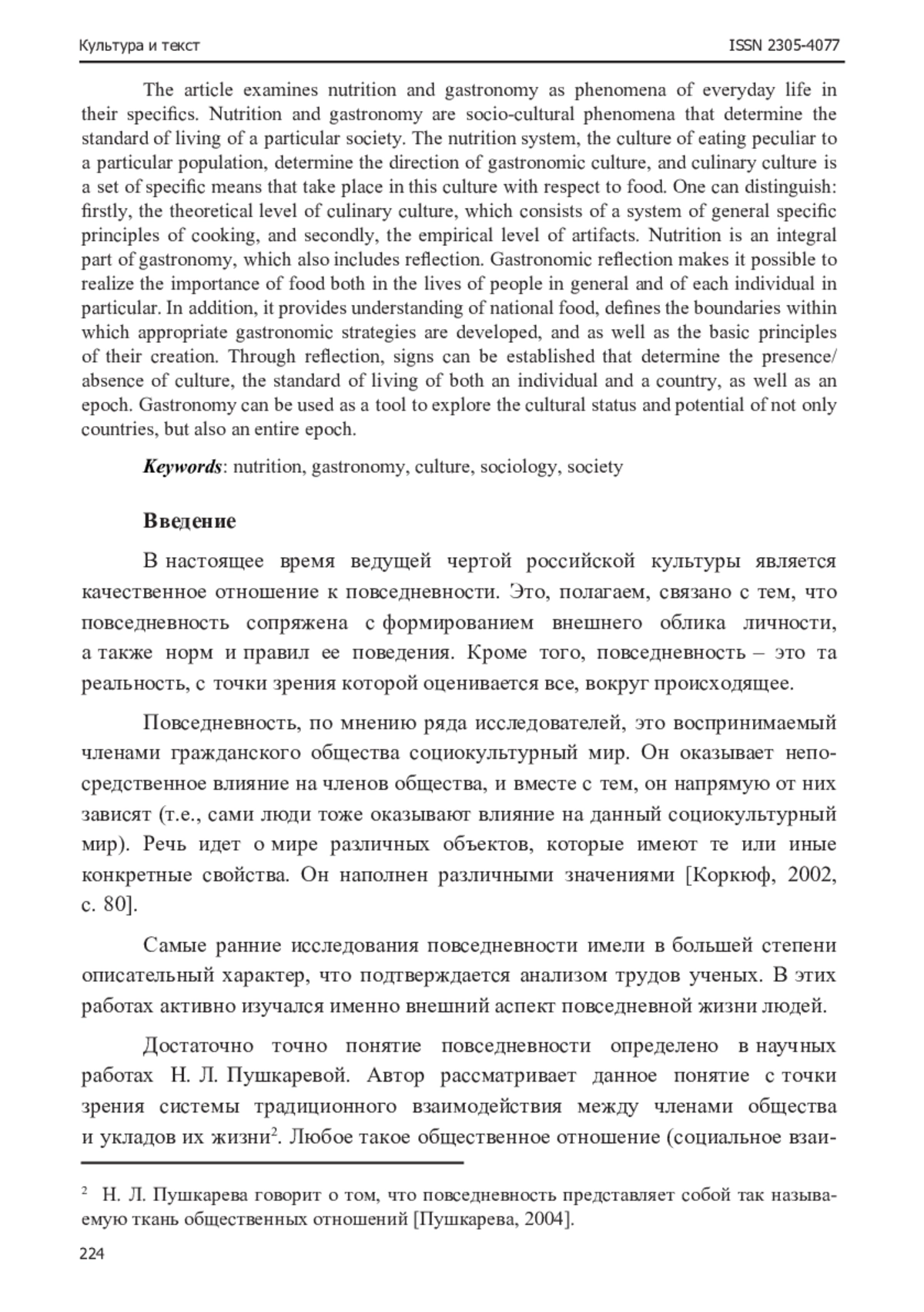 В статье рассматриваются питание и гастрономия как феномены повседневности в их специфике.