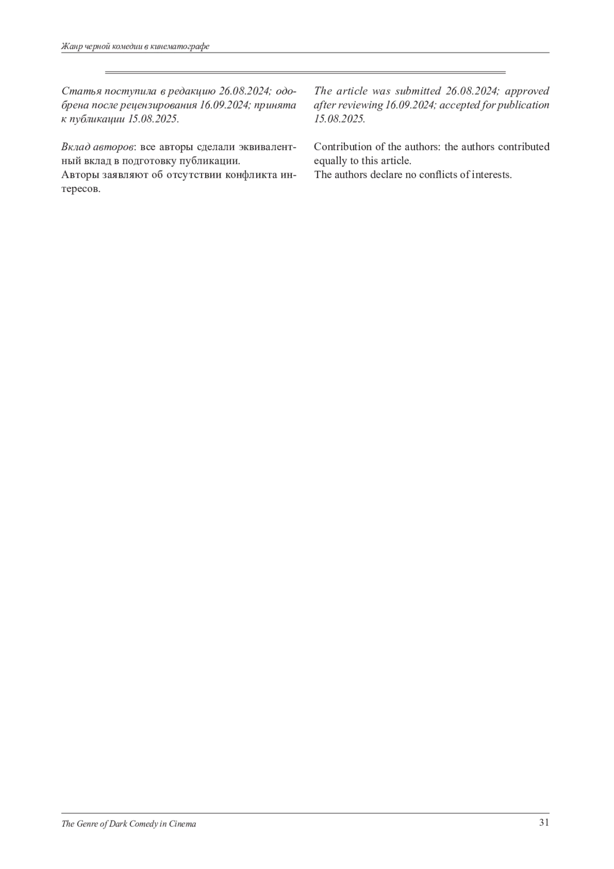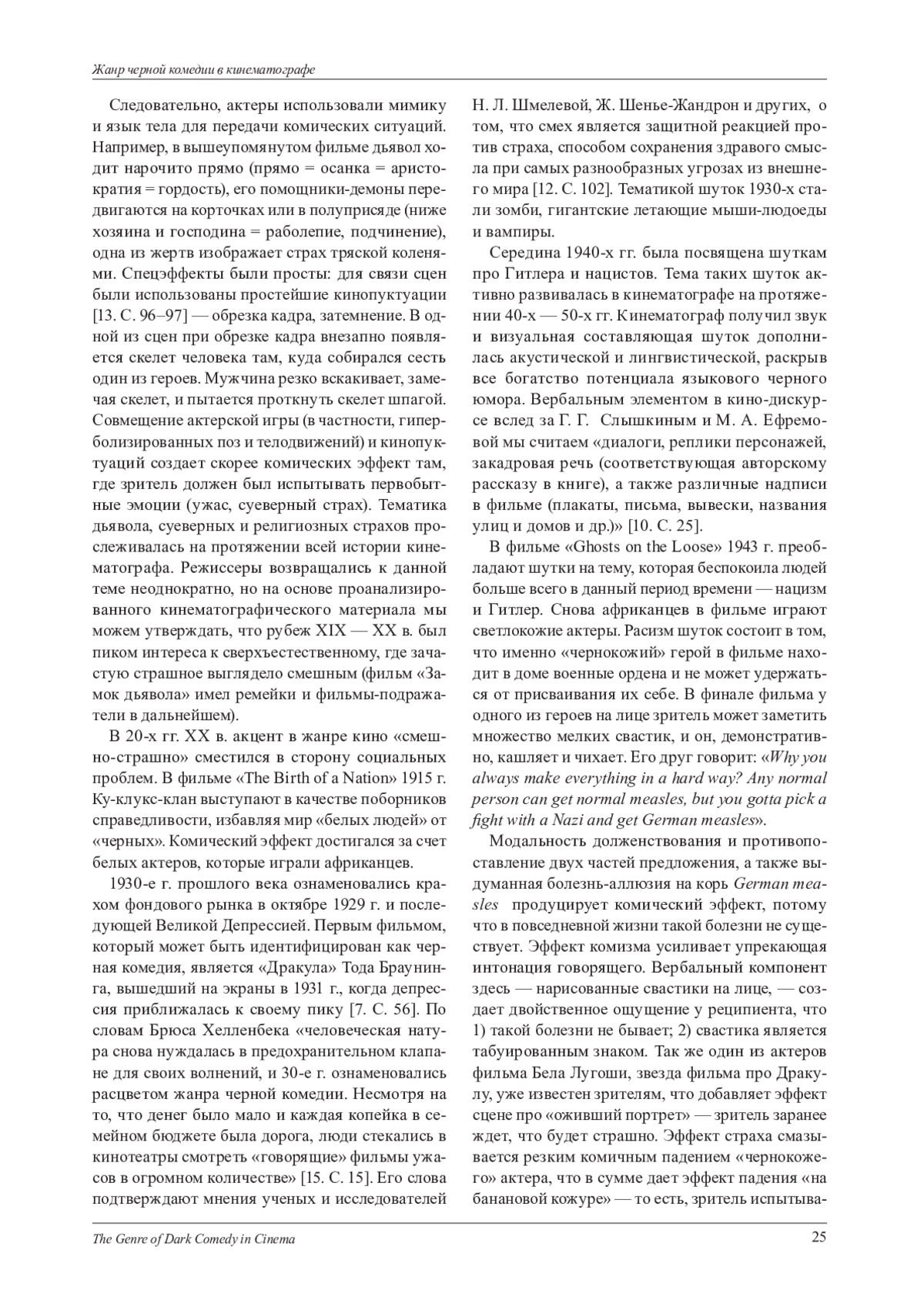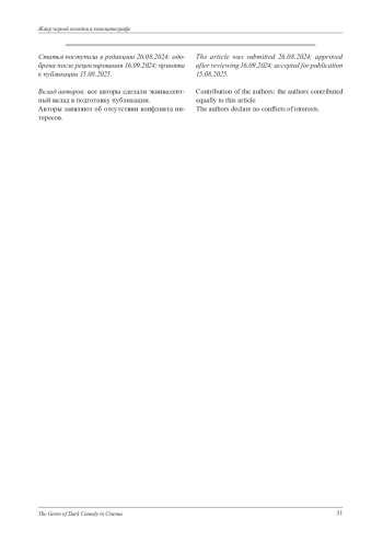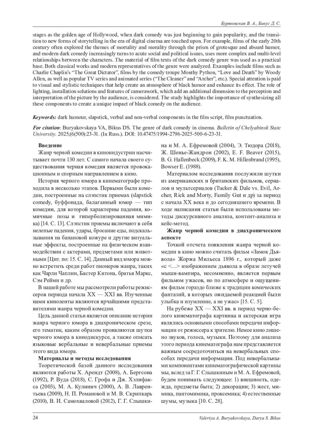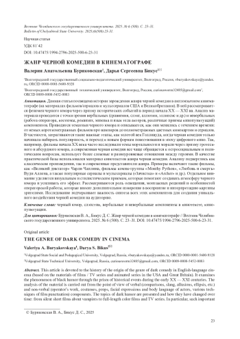 Данная статья посвящена истории зарождения жанра черной комедии в англоязычном кинематографе (на материалах фильмов/сериалов и мультсериалов США и Великобритании). В ней рассматривается феномен черного юмора через призму исторических событий в период начала XX - XXI вв. Анализ материала проводится с точки зрения вербальных (сравнения, слэнг, аллюзии, эллипсис и др.) и невербальных (работа оператора, костюмы, реквизит, мимика и язык тела актеров, различные приемы кинопунктуаций) компонентов. Приводятся тематики черного юмора и описывается, как они менялись с течением времени: от немых короткометражных фильмов про вампиров до полнометражных цветных кинокартин и сериалов. В частности, затрагиваются такие важные этапы, как золотой век Голливуда, когда черная комедия только начинала набирать популярность, и переход к новым формам повествования в эпоху цифрового кино. Так, например, фильмы начала XX века часто исследовали темы мортальности и морали через призму гротескного и абсурдного юмора, а современная черная комедия все чаще обращается к остросоциальным и политическим вопросам, использует более сложные и разноуровневые отношения между героями. В качестве практической базы использовался материал кинотекстов жанра черная комедия. Анализу подверглись как классические произведения, так и современные представители жанра. Примеры включают такие фильмы, как «Великий диктатор» Чарли Чаплина, фильмы комик-труппы «Monthy Python», «Любовь и смерть» Вуди Аллена, а также популярные сериалы и мультсериалы («Зачистка» и «Archer» и др.). Отдельное внимание уделяется визуальным и стилистическим приемам, которые помогают создавать атмосферу черного юмора и усиливать его эффект. Рассматриваются роль освещения, монтажных решений и особенностей операторской работы, которые вносят дополнительное измерение в восприятие и интерпретацию картины зрителями. Исследование подчеркивает важность синтеза всех этих компонентов для создания уникального воздействия черной комедии на аудиторию.