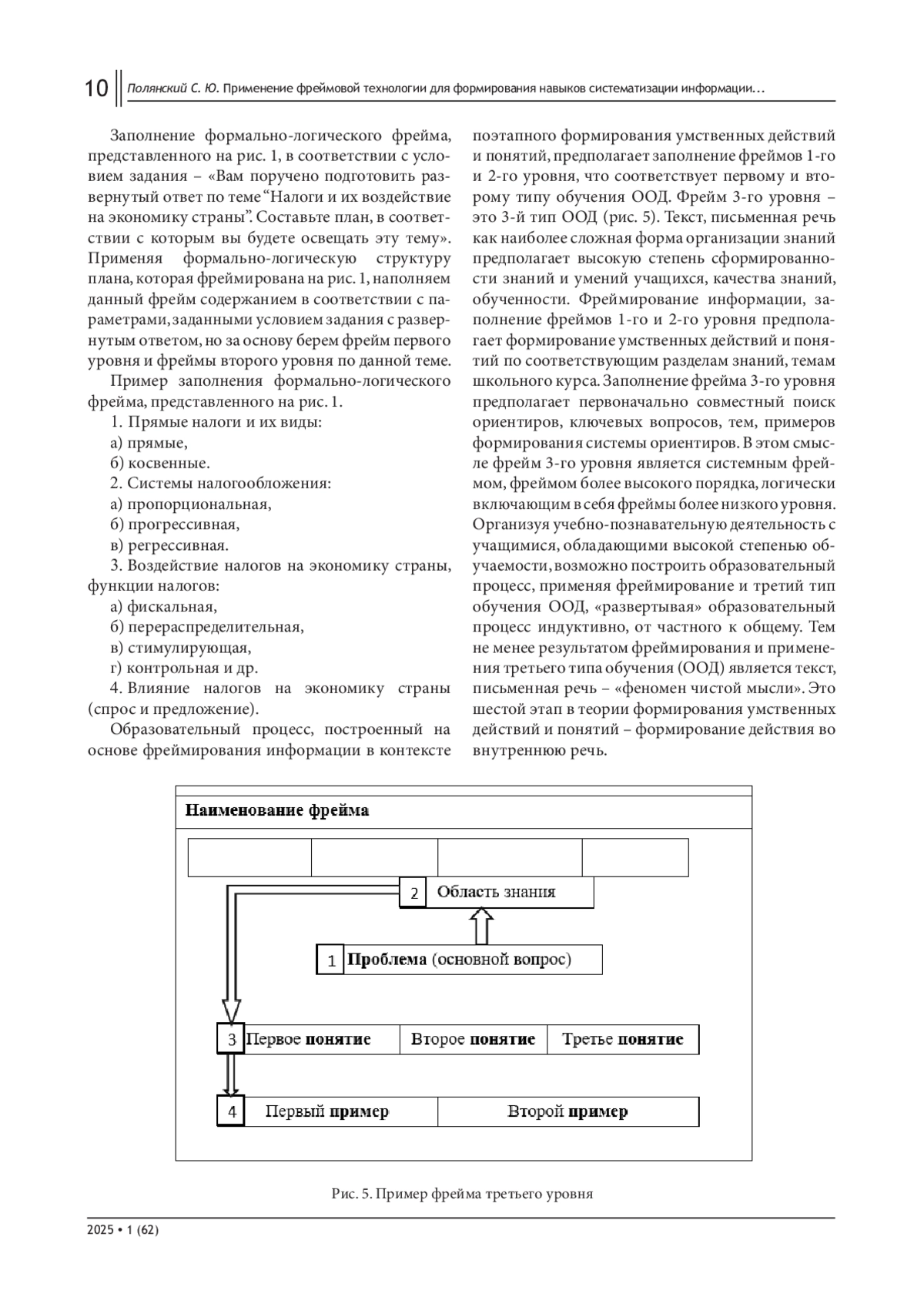 В статье рассматриваются педагогические особенности, методические аспекты организации образовательного процесса с помощью фреймовой технологии. Акцентируется внимание на формировании системы знаний и системного восприятия информации при помощи фреймовой технологии в контексте поэтапного формирования умственных действий и понятий. Основное внимание уделено методическим и дидактическим аспектам фреймовой технологии в формировании навыков выполнения заданий с развернутым ответом по обществознанию у учащихся старших классов.