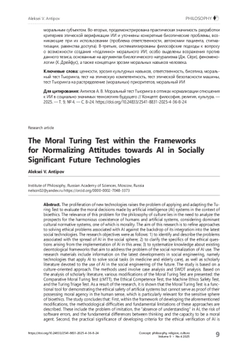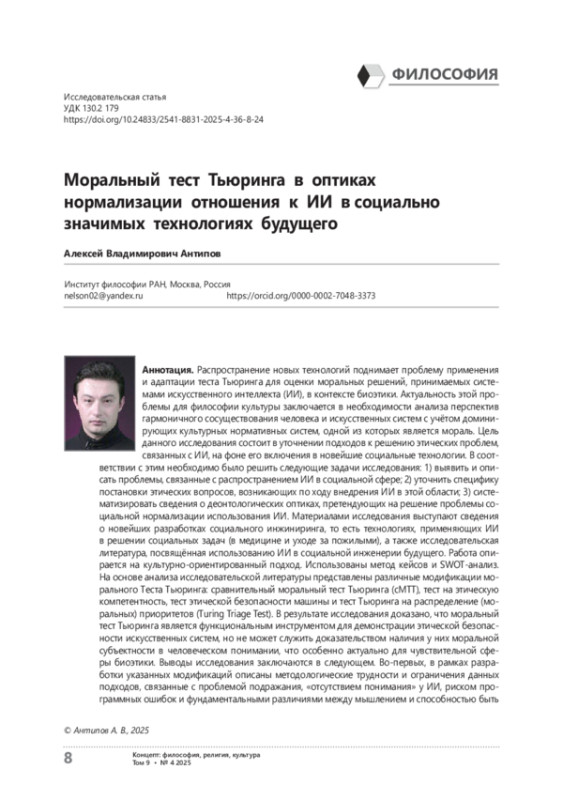 Распространение новых технологий поднимает проблему применения и адаптации теста Тьюринга для оценки моральных решений, принимаемых системами искусственного интеллекта (ИИ), в контексте биоэтики. Актуальность этой проблемы для философии культуры заключается в необходимости анализа перспектив гармоничного сосуществования человека и искусственных систем с учётом доминирующих культурных нормативных систем, одной из которых является мораль. Цель данного исследования состоит в уточнении подходов к решению этических проблем, связанных с ИИ, на фоне его включения в новейшие социальные технологии. В соответствии с этим необходимо было решить следующие задачи исследования: 1) выявить и описать проблемы, связанные с распространением ИИ в социальной сфере; 2) уточнить специфику постановки этических вопросов, возникающих по ходу внедрения ИИ в этой области; 3) систематизировать сведения о деонтологических оптиках, претендующих на решение проблемы социальной нормализации использования ИИ. Материалами исследования выступают сведения о новейших разработках социального инжиниринга, то есть технологиях, применяющих ИИ в решении социальных задач (в медицине и уходе за пожилыми), а также исследовательская литература, посвящённая использованию ИИ в социальной инженерии будущего. Работа опирается на культурно-ориентированный подход. Использованы метод кейсов и SWOT-анализ. На основе анализа исследовательской литературы представлены различные модификации морального Теста Тьюринга: сравнительный моральный тест Тьюринга (сМТТ), тест на этическую компетентность, тест этической безопасности машины и тест Тьюринга на распределение (моральных) приоритетов (Turing Triage Test). В результате исследования доказано, что моральный тест Тьюринга является функциональным инструментом для демонстрации этической безопасности искусственных систем, но не может служить доказательством наличия у них моральной субъектности в человеческом понимании, что особенно актуально для чувствительной сферы биоэтики. Выводы исследования заключаются в следующем. Во-первых, в рамках разработки указанных модификаций описаны методологические трудности и ограничения данных подходов, связанные с проблемой подражания, «отсутствием понимания» у ИИ, риском программных ошибок и фундаментальными различиями между мышлением и способностью быть моральным субъектом. Во-вторых, продемонстрирована практическая значимость разработки критериев этической верификации ИИ и уточнены конкретные биоэтические проблемы, возникающие при их использовании (проблема ответственности, автономии пациента, стигматизации, равенства доступа). В-третьих, систематизированы философские подходы к вопросу о возможности создания «подлинно» морального ИИ; особо выделены возражения против данного тезиса, основанные на аргументах биологического натурализма (Дж. Сёрл), феноменологии (Х. Дрейфус), а также концепции эрозии моральных навыков человека.