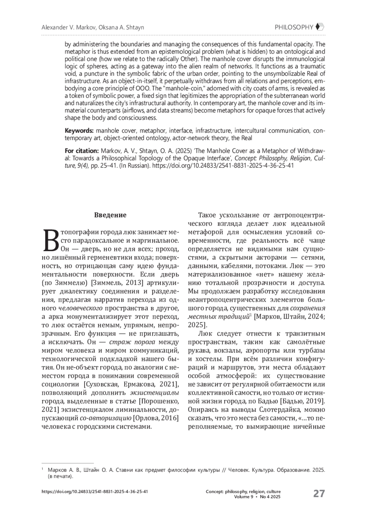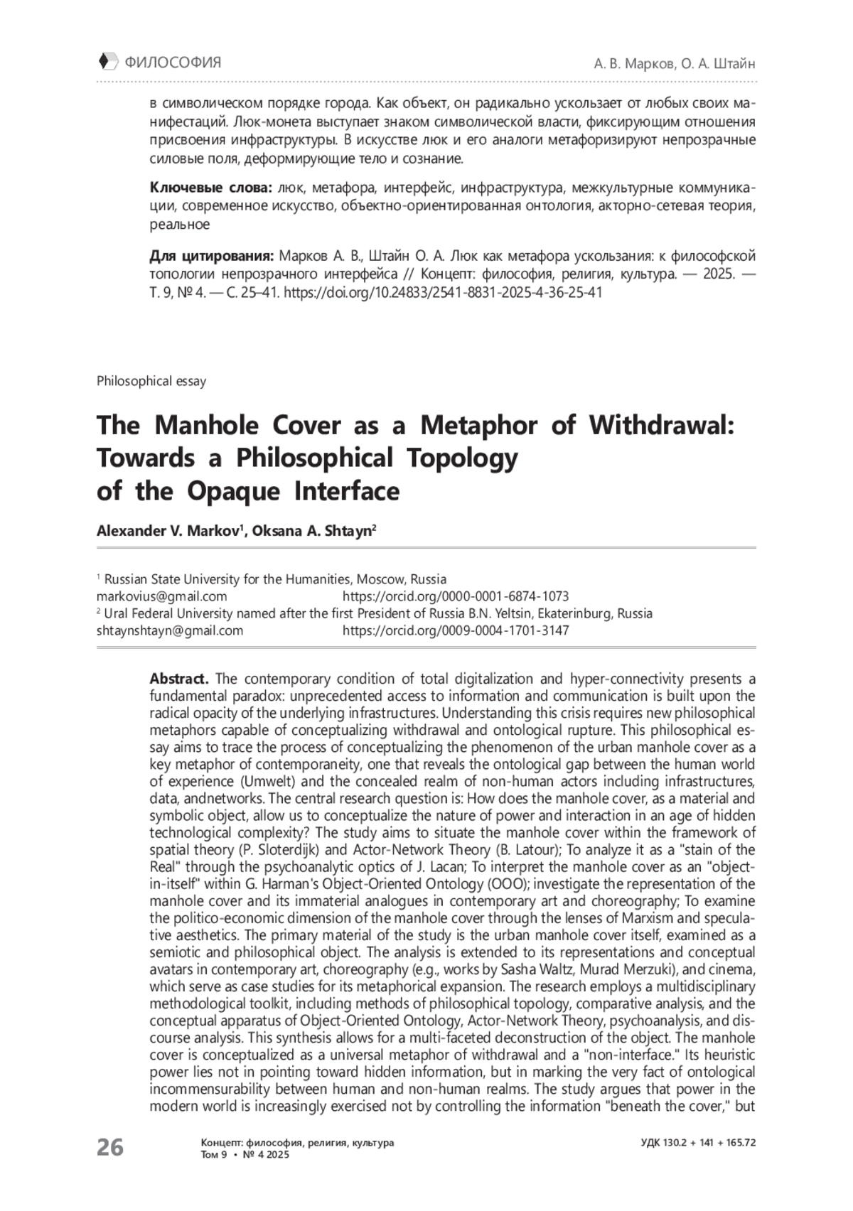 В условиях тотальной цифровизации и гиперсвязности повседневный опыт характеризуется парадоксом: беспрецедентный доступ к информации и коммуникации основан на принципиальной непрозрачности обеспечивающих их инфраструктур. Осмысление этого кризиса требует новых философских метафор, способных концептуализировать ускользание и разрыв. Цель работы — проследить процессы конептуализации феномена городского люка в качестве одной из ключевых метафор современности. В задачи исследования входило: 1. Уточнить феномен люка в контексте пространственных теорий (П. Слотердайк) и акторно-сетевого подхода (Б. Латур). 2. Проанализировать люк как «пятно Реального» в психоаналитической оптике Ж. Лакана. 3. Интерпретировать люк как «объект-в-себе» в рамках объектно-ориентированной онтологии Г. Хармана. 4. Проследить репрезентацию люка и его нематериальных аналогов в современном искусстве и хореографии. 5. Рассмотреть политико-экономическое измерение люка через призму марксизма и спекулятивной эстетики. Материалами исследования выступает городской люк как феномен, рассмотренный как семиотический и философский объект, а также его репрезентации в современном искусстве, хореографии (Саша Вальц, Мурад Мерзуки) и кинематографе. Применяются методы философской топологии, сравнительного анализа, концептуальный аппарат ООО, АСТ, психоанализа и дискурс-анализа. В результате исследования люк концептуализирован как универсальная метафора ускользания и «не-интерфейс», раскрывающая онтологический разрыв между человеческим миром опыта (Umwelt) и скрытым миром нечеловеческих акторов (инфраструктур, данных, сетей). Эвристическая сила этой метафоры заключается не в указании на скрытую информацию, а в маркировке самого факта онтологической несоизмеримости. Власть в современном мире осуществляется не через доступ к информации «под люком», но через контроль над границами между несоизмеримыми реальностями. Выводы. Люк нарушает логику сфер, являясь шлюзом в мир сетей. Он представляет собой травматическую дыру в символическом порядке города. Как объект, он радикально ускользает от любых своих манифестаций. Люк-монета выступает знаком символической власти, фиксирующим отношения присвоения инфраструктуры. В искусстве люк и его аналоги метафоризируют непрозрачные силовые поля, деформирующие тело и сознание.