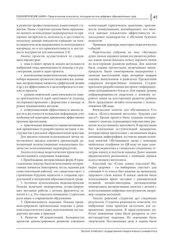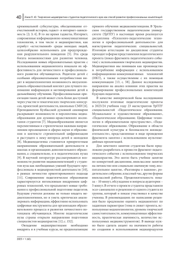 Статья посвящена анализу влияния творческих медиапрактик на формирование профессиональных компетенций студентов педагогических специальностей Уральского государственного педагогического университета (УрГПУ). На основе анализа итоговых педагогических проектов, представленных в формате мультимедийных презентаций, исследование выявляет эвентуальный продукт работы студентов над медиаконтентом: развитие критического мышления, креативности, коммуникативных навыков, готовности к инновационной деятельности будущих педагогов.