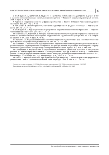 6. Симбирцева Н. А., Шалагина Е. В. Трудности и перспективы использования медиапрактик с детьми с ОВЗ в условиях инклюзивной школы: социальные оценки педагогов // Казанский социально-гуманитарный вестник. 2024. № 2 (65). С. 48-60. EDN: ENTPHB