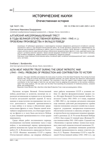 В публикации выявляются и анализируются основные направления деятельности Алтайского мясопромышленного треста в годы Великой Отечественной войны. На основе архивных документов и опубликованных материалов рассматриваются особенности работы треста в военных условиях. Автор приходит к выводу, что мясная отрасль региона внесла существенный вклад в обеспечение продовольствием фронта и тыла, адаптируя выпуск продукции к условиям военного времени. Кроме мясной продукции Алтайский трест в военные годы освоил производство лечебных препаратов, товаров широкого потребления, предметов одежды.