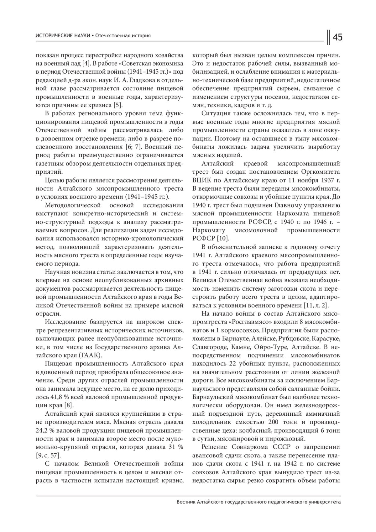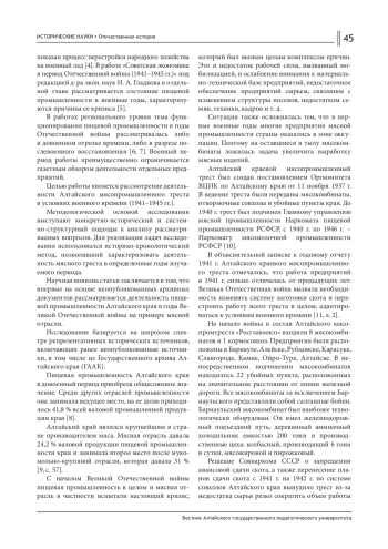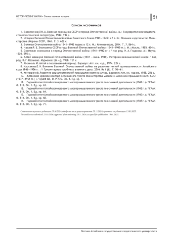 8. Курсакова Е. Н. Влияние Великой Отечественной войны на развитие легкой промышленности Алтайского края 1946-1956 гг. // Гуманитарные проблемы военного дела. 2016. № 1 (6). С. 56-61. EDN: WCBQRB