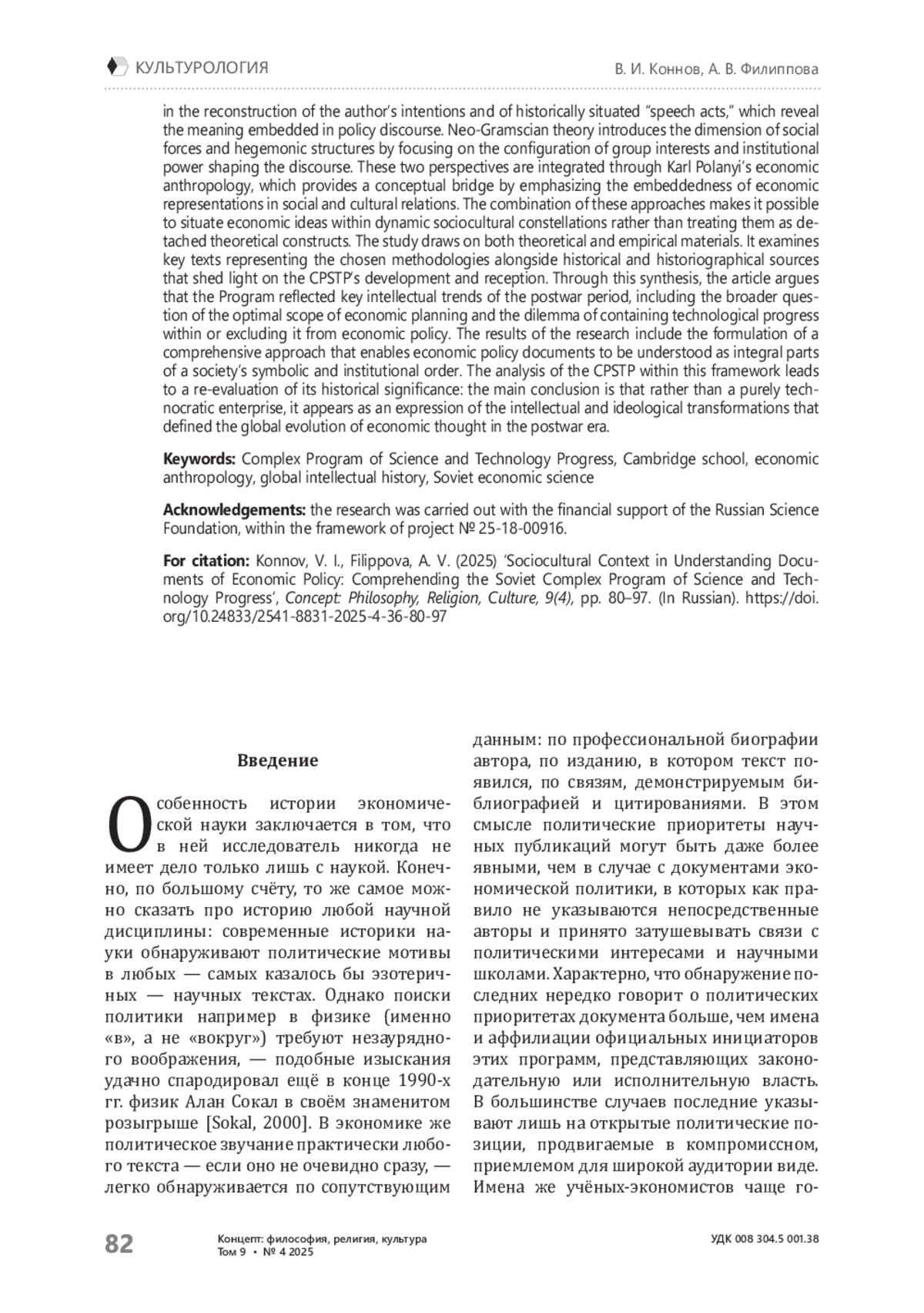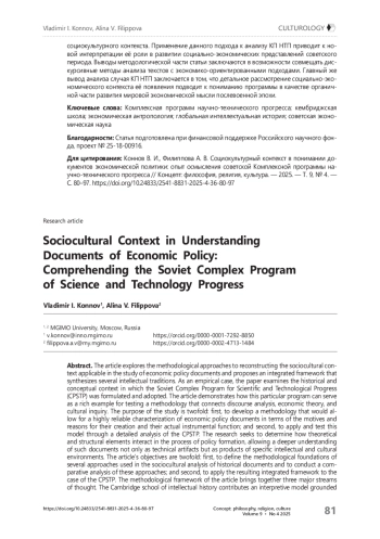 В статье рассматриваются методологические подходы к реконструкции социокультурного контекста, применимые при исследовании документов экономической политики, и предлагается вариант их сочетания. В качестве примера использования такой комплексной методологии анализируется контекст создания советской Комплексной программы научно-технического прогресса (КП НТП). Цель исследования — сформировать методологию, которая позволяла бы с высокой степенью достоверности характеризовать документы экономической политики с точки зрения причин их появления и реальной инструментальной роли, а затем апробировать данную методологию применительно к случаю КП НТП. Задачи статьи включают определение методологических основ ряда подходов, используемых в социокультурном анализе исторических документов — кембриджской школы интеллектуальной истории, неограмшианской теории, экономической антропологии; сопоставительный анализ этих основ для определения возможности их взаимного дополнения; анализ случая КП НТП с позиций сформированного комплексного подхода, позволяющий понять причины появления программы и её цели. Исследование задействует как теоретический материал — ключевые тексты, представляющие рассматриваемые концепции, — так и исторический и историографический, соответственно позволяющий сформировать представление о КП НТП. Сформированный и применённый таким образом метод основан на дополнении линии интеллектуальной истории, которая ориентирована на воспроизведение представлений автора, направляющих его «речевые акты», неограмшианской реконструкцией конфигурации групповых интересов, характеризующих определённую историческую ситуацию. Для того, чтобы ввести объединяющие эти подходы звено, статья обращается к экономической антропологии К. Поланьи. Результатом исследования становится формирование комплексного подхода, позволяющего рассматривать экономические идеи как органическую часть более широкого социокультурного контекста. Применение данного подхода к анализу КП НТП приводит к новой интерпретации её роли в развитии социально-экономических представлений советского периода. Выводы методологической части статьи заключаются в возможности совмещать дискурсивные методы анализа текстов с экономико-ориентированными подходами. Главный же вывод анализа случая КП НТП заключается в том, что детальное рассмотрение социально-экономического контекста её появления подводит к пониманию программы в качестве органичной части развития мировой экономической мысли послевоенной эпохи.
