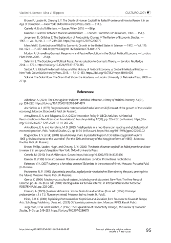 1. Антюхова Е. А., Крынжина М. Д. Интеллигенция в неограмшианском прочтении и глобальной политэкономической практике. // Полис. Политические исследования. - 2025. - № 2. - С. 8-24. https://doi.org/10.17976/jpps/2025.02.02