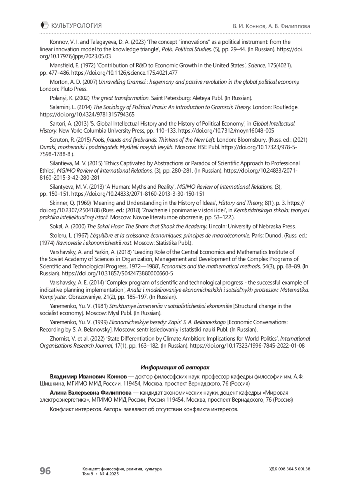 9. Коннов В. И., Талагаева Д. А. Понятие «инновации» как политический инструмент: от линейной инновационной модели к «треугольнику знаний». // Полис. Политические исследования. - 2023. - № 5. - С. 29-44. https://doi.org/10.17976/jpps/2023.05.03