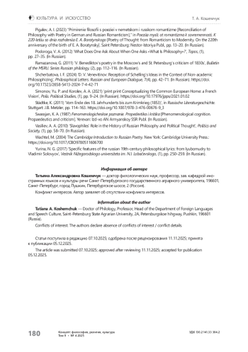 25. Щербатова И. Ф. Д. В. Веневитинов: рецепция идей Шеллинга в контексте неакадемического философствования // Философические письма. Русско-европейский диалог. - 2024. - Т. 7, № 4. - С. 42-71. https://doi.org/10.17323/2658-5413-2024-7-4-42-71