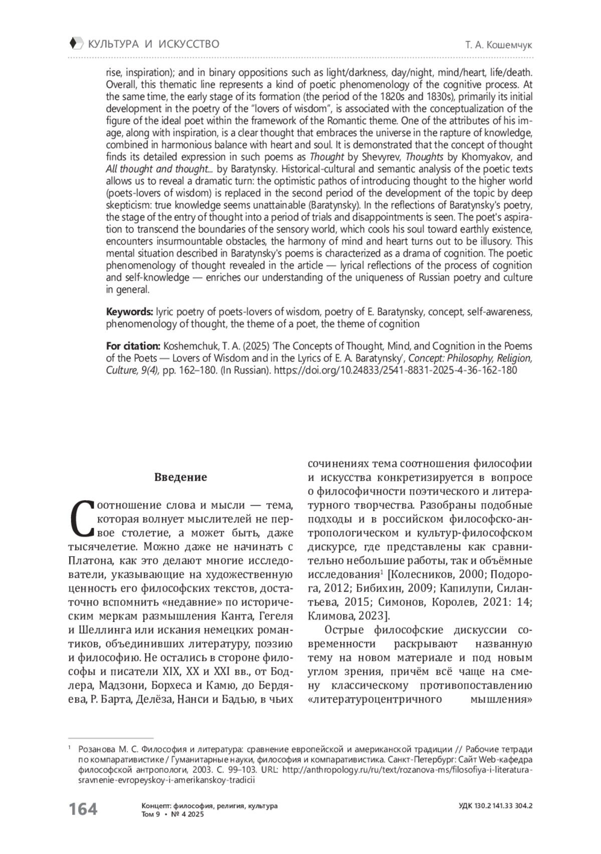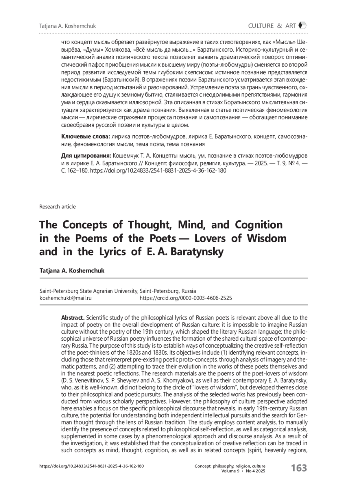 Научное рассмотрение философской лирики русских поэтов актуально прежде всего в силу влияния поэзии на развитие российской культуры в целом: её невозможно представить без поэзии ХIХ в., сформировавшей литературный русский язык; философский мир русской поэзии влияет на формирование общего культурного пространства современной России. Целью данного исследования является установление путей концептуализации творческой саморефлексии поэтов-мыслителей 20-х и 30-х гг. XIX века; его задачи — (1) выявление соответствующих концептов (получивших переосмысление присутствовавших ранее поэтических прото-концептов) путём поиска релевантных понятий и образных решений, а также (2) попытка проследить их эволюцию в творчестве самих этих поэтов и в ближайших по времени поэтических рефлексиях. Материалами исследования послужили стихотворения поэтов-любомудров (Д. С. Веневитинова, С. П. Шевырёва и А. С. Хомякова), а также их современника Е. А. Баратынского, не принадлежавшего, как известно, кругу любомудров, но развивавшего темы, близкие их философско-поэтическим исканиям. Анализ выбранных произведений, разумеется, проводился и ранее, причём в различных научных призмах. Избранная в данном случае оптика философии культуры позволяет сконцентрировать внимание на специфическом философском дискурсе, раскрывшем в русской культуре первой трети ХIХ в. потенциал осмысления как самостоятельных поисков, так и поисков немецкой мысли, воспринятой на фоне русской традиции. В работе использован контент-анализ (для выявления в ручном режиме наличия концептов, связанных с философской саморефлексией), а также категориальный анализ, дополненный в отдельных случаях феноменологическим подходом и дискурс-анализом. В результате исследования установлено, что концептуализация творческой рефлексии прослеживается в таких понятиях, как ум, мысль, познание, а также в сопряжённых с ними (дух, небесные края, взлет, вдохновение и др.); и в бинарных оппозициях, таких как свет/тьма, день/ночь, разум/сердце, жизнь/смерть. Так что в целом выделенная в исследовании тематическая линия представляет собой своего рода поэтическую феноменологию процесса познания. При этом ранний этап ее становления (период 1820-х и 1830-х гг.), прежде всего её первое развитие в поэзии любомудров, связан с концептуализацией в рамках романтической темы фигуры идеального поэта. Одним из атрибутов его образа, наряду с вдохновением, становится ясная мысль, охватывающая мироздание в восторге познания, соединённая в гармоническом равновесии с сердцем и душой. Показано, что концепт мысль обретает развёрнутое выражение в таких стихотворениях, как «Мысль» Шевырёва, «Думы» Хомякова, «Всё мысль да мысль…» Баратынского. Историко-культурный и семантический анализ поэтического текста позволяет выявить драматический поворот: оптимистический пафос приобщения мысли к высшему миру (поэты-любомудры) сменяется во второй период развития исследуемой темы глубоким скепсисом: истинное познание представляется недостижимым (Баратынский). В отражениях поэзии Баратынского усматривается этап вхождения мысли в период испытаний и разочарований. Устремление поэта за грань чувственного, охлаждающее его душу к земному бытию, сталкивается с неодолимыми препятствиями, гармония ума и сердца оказывается иллюзорной. Эта описа