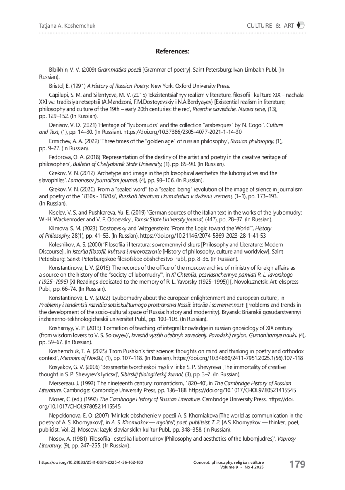 15. Кошемчук Т. А. Из первой науки Пушкина: мысли об уме и мышлении в стихотворениях поэта и православный контекст // Ученые записки Новгородского государственного университета. - 2025. - № 1. - С. 107-118. https://doi.org/10.34680/2411-7951.2025.1(56).107-118