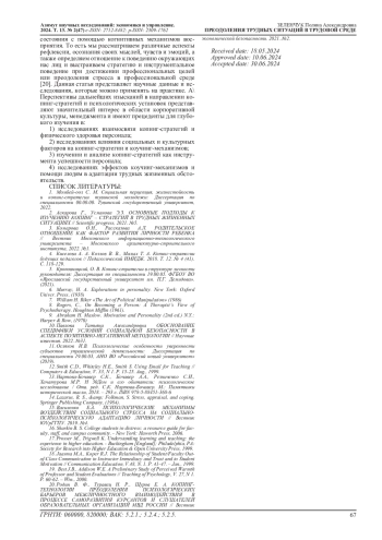 2. Аскарова Г., Усманова Э.З. ОСНОВНЫЕ ПОДХОДЫ К ИЗУЧЕНИЮ КОПИНГ - СТРАТЕГИЙ В ТРУДНЫХ ЖИЗНЕННЫХ СИТУАЦИЯХ // Scientific progress, 2021. №5.