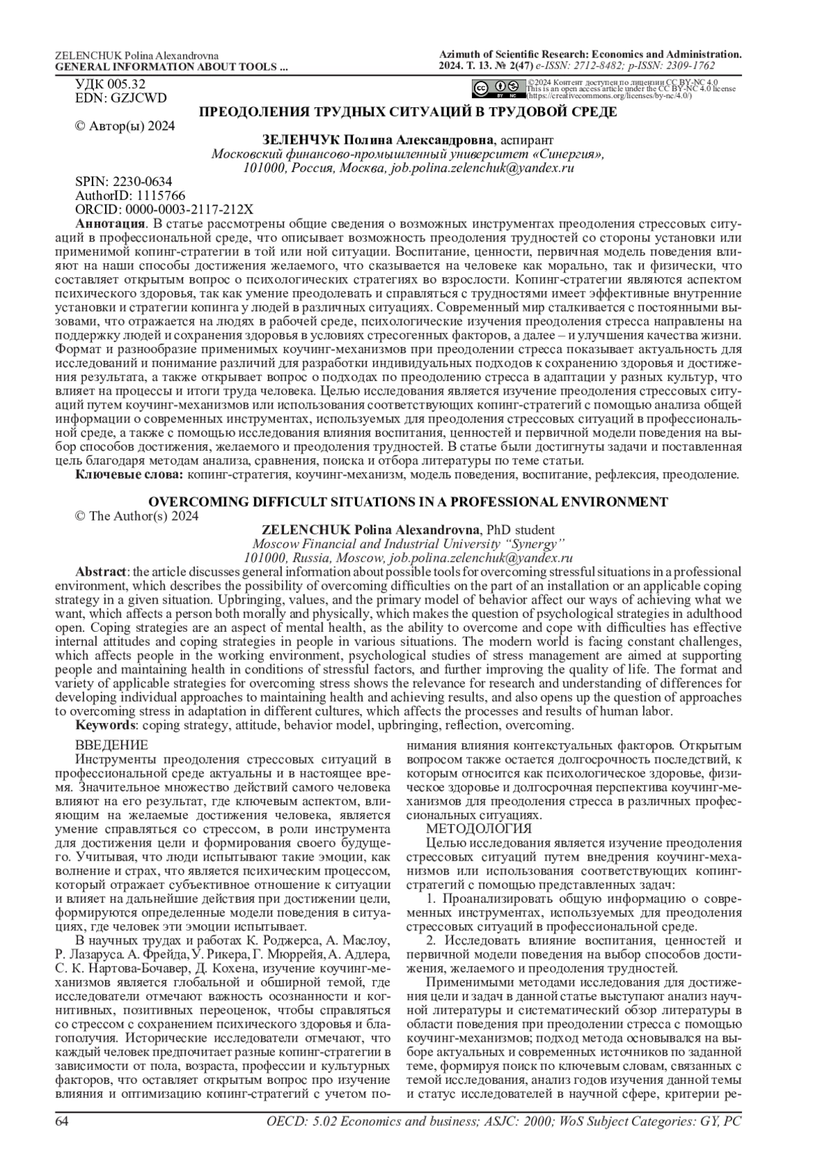 В статье рассмотрены общие сведения о возможных инструментах преодоления стрессовых ситуаций в профессиональной среде, что описывает возможность преодоления трудностей со стороны установки или применимой копинг-стратегии в той или ной ситуации. Воспитание, ценности, первичная модель поведения - влияют на наши способы достижения желаемого, что сказывается на человеке как морально, так и физически, что составляет открытым вопрос о психологических стратегиях во взрослости. Копинг-стратегии являются аспектом психического здоровья, так как умение преодолевать и справляться с трудностями имеет эффективные внутренние установки и стратегии копинга у людей в различных ситуациях. Современный мир сталкивается с постоянными вызовами, что отражается на людях в рабочей среде, психологические изучения преодоления стресса направлены на поддержку людей и сохранения здоровья в условиях стресогенных факторов, а далее и улучшения качества жизни. Формат и разнообразие применимых коучинг-механизмов при преодолении стресса показывает актуальность для исследований и понимание различий для разработки индивидуальных подходов к сохранению здоровья и достижения результата, а также открывает вопрос о подходах по преодолению стресса в адаптации у разных культур, что влияет на процессы и итоги труда человека.