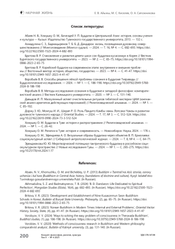 2. Ахмадулина С. З., Бадмацыренов Т. Б. Б. Д. Дандарон: жизнь, посвященная духовному совершенствованию // Монголоведение (Монгол судлал). - 2024. - Т. 16, № 4. - С. 682-693. https://doi.org/10.22162/2500-1523-2024-4-682-693