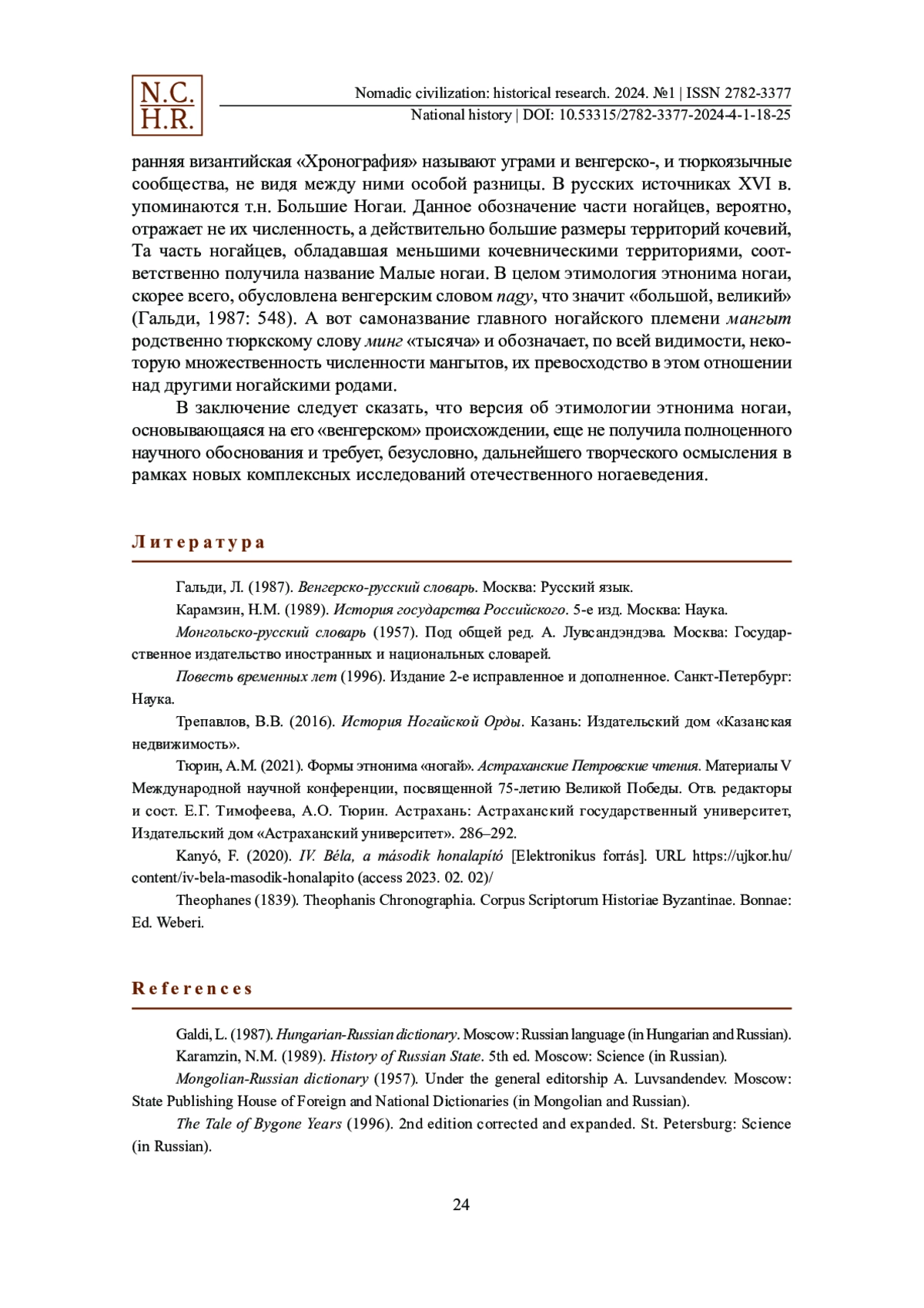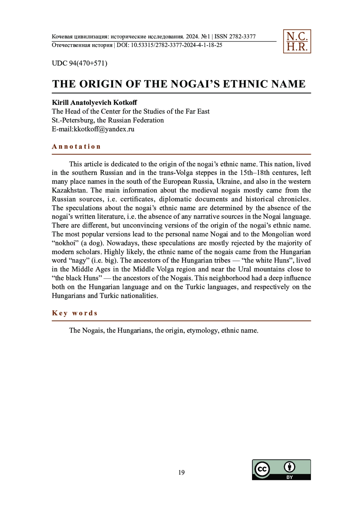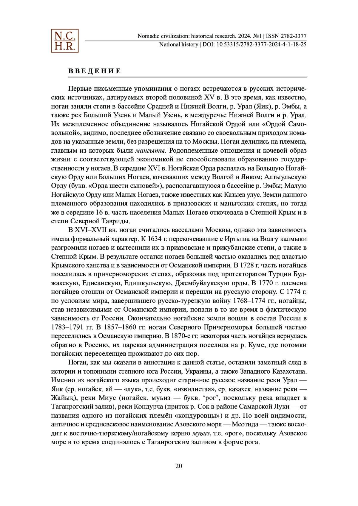 Настоящая статья посвящена вопросам происхождения тюркского этнонима ногай, являющегося самоназванием ногайского этноса. Данный кочевой народ, населявший в XV–XVIII вв. южнорусские и заволжские степи, оставил заметный след в истории и топонимике юга России, Украины, а также Казахстана. Информация о средневековых ногаях сохранилась главным образом в русских исторических источниках — грамотах, дипломатических переписках, летописях. Выявление этимологии этнонима самоназвания ногайского народа затруднено отсутствием у этноса письменной литературы и, как следствие, корпуса повествовательных источников. Относительно происхождения самоназвания ногаев существуют разные, но, на наш взгляд, малоубедительные версии. Чаще всего этноним возводят к личному имени Ногай, а также к монгольскому слову нохой ‘собака’. Обе существующие версии в настоящее время не поддерживаются большинством учёных. Скорее всего, этноним ногаи происходит от венгерского слова nagy, что значит ‘большой’. В пользу данной версии говорит то, что в средние века предки мадьяр и других венгерских племён, т. н. «белые угры», соседствовали в Среднем Поволжье и в Приуралье с «чёрными уграми», т. е. ногаями. Вполне естественно, что длительное соседство и взаимодействие в историческом прошлом названных племен могли привести к проникновению в оба языка тех или иных слов и понятий из их лексикона, обусловив, как в данном случае, самоназвание ногайского этноса.