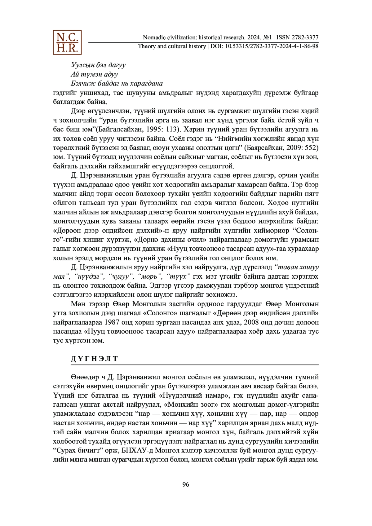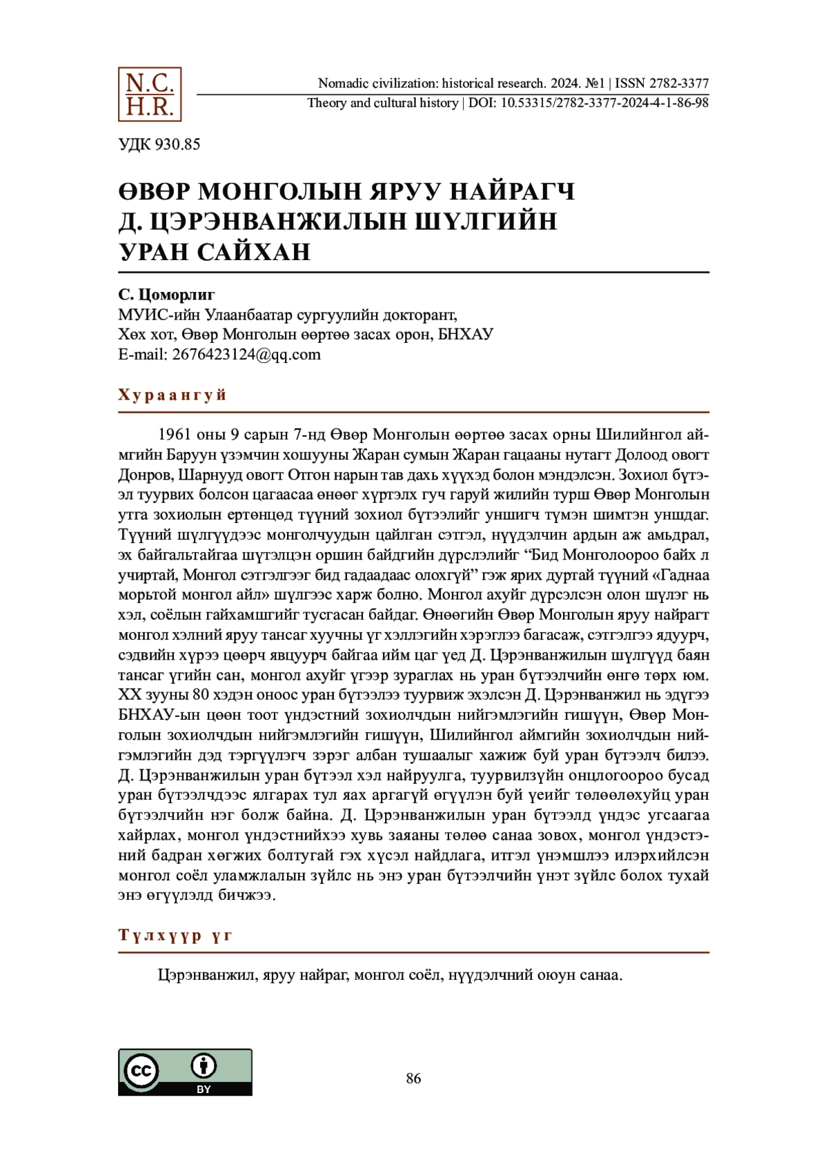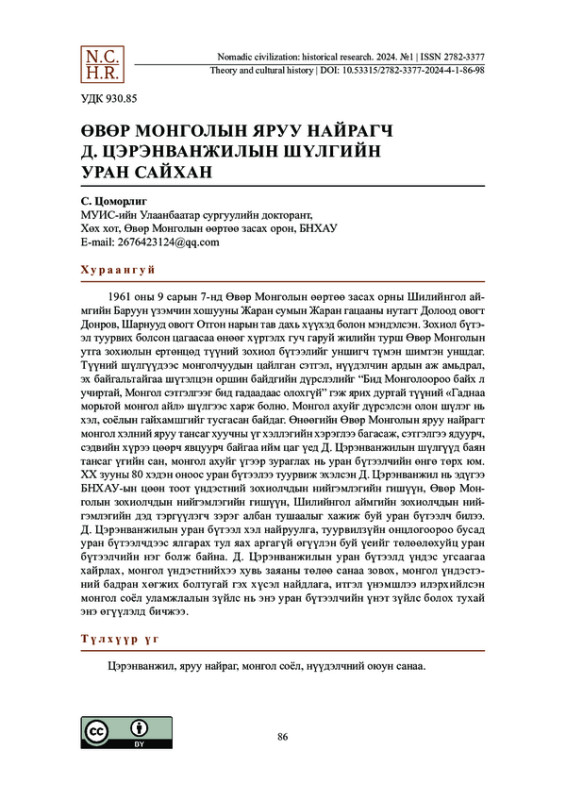 1961 оны 9 сарын 7-нд Өвөр Монголын өөртөө засах орны Шилийнгол аймгийн Баруун үзэмчин хошууны Жаран сумын Жаран гацааны нутагт Долоод овогт Донров, Шарнууд овогт Отгон нарын тав дахь хүүхэд болон мэндэлсэн. Зохиол бүтээл туурвих болсон цагаасаа өнөөг хүртэлх гуч гаруй жилийн турш Өвөр Монголын утга зохиолын ертөнцөд түүний зохиол бүтээлийг уншигч түмэн шимтэн уншдаг. Түүний шүлгүүдээс монголчуудын цайлган сэтгэл, нүүдэлчин ардын аж амьдрал, эх байгальтайгаа шүтэлцэн оршин байдгийн дүрслэлийг “Бид Монголоороо байх л учиртай, Монгол сэтгэлгээг бид гадаадаас олохгүй” гэж ярих дуртай түүний «Гаднаа морьтой монгол айл» шүлгээс харж болно. Монгол ахуйг дүрсэлсэн олон шүлэг нь хэл, соёлын гайхамшгийг тусгасан байдаг. Өнөөгийн Өвөр Монголын яруу найрагт монгол хэлний яруу тансаг хуучны үг хэллэгийн хэрэглээ багасаж, сэтгэлгээ ядуурч, сэдвийн хүрээ цөөрч явцуурч байгаа ийм цаг үед Д. Цэрэнванжилын шүлгүүд баян тансаг үгийн сан, монгол ахуйг үгээр зураглах нь уран бүтээлчийн өнгө төрх юм. ХХ зууны 80 хэдэн оноос уран бүтээлээ туурвиж эхэлсэн Д. Цэрэнванжил нь эдүгээ БНХАУ-ын цөөн тоот үндэстний зохиолчдын нийгэмлэгийн гишүүн, Өвөр Монголын зохиолчдын нийгэмлэгийн гишүүн, Шилийнгол аймгийн зохиолчдын нийгэмлэгийн дэд тэргүүлэгч зэрэг албан тушаалыг хажиж буй уран бүтээлч билээ. Д. Цэрэнванжилын уран бүтээл хэл найруулга, туурвилзүйн онцлогоороо бусад уран бүтээлчдээс ялгарах тул яах аргагүй өгүүлэн буй үеийг төлөөлөхуйц уран бүтээлчийн нэг болж байна. Д. Цэрэнванжилын уран бүтээлд үндэс угсаагаа хайрлах, монгол үндэстнийхээ хувь заяаны төлөө санаа зовох, монгол үндэстэний бадран хөгжих болтугай гэх хүсэл найдлага, итгэл үнэмшлээ илэрхийлсэн монгол соёл уламжлалын зүйлс нь энэ уран бүтээлчийн үнэт зүйлс болох тухай энэ өгүүлэлд бичжээ.