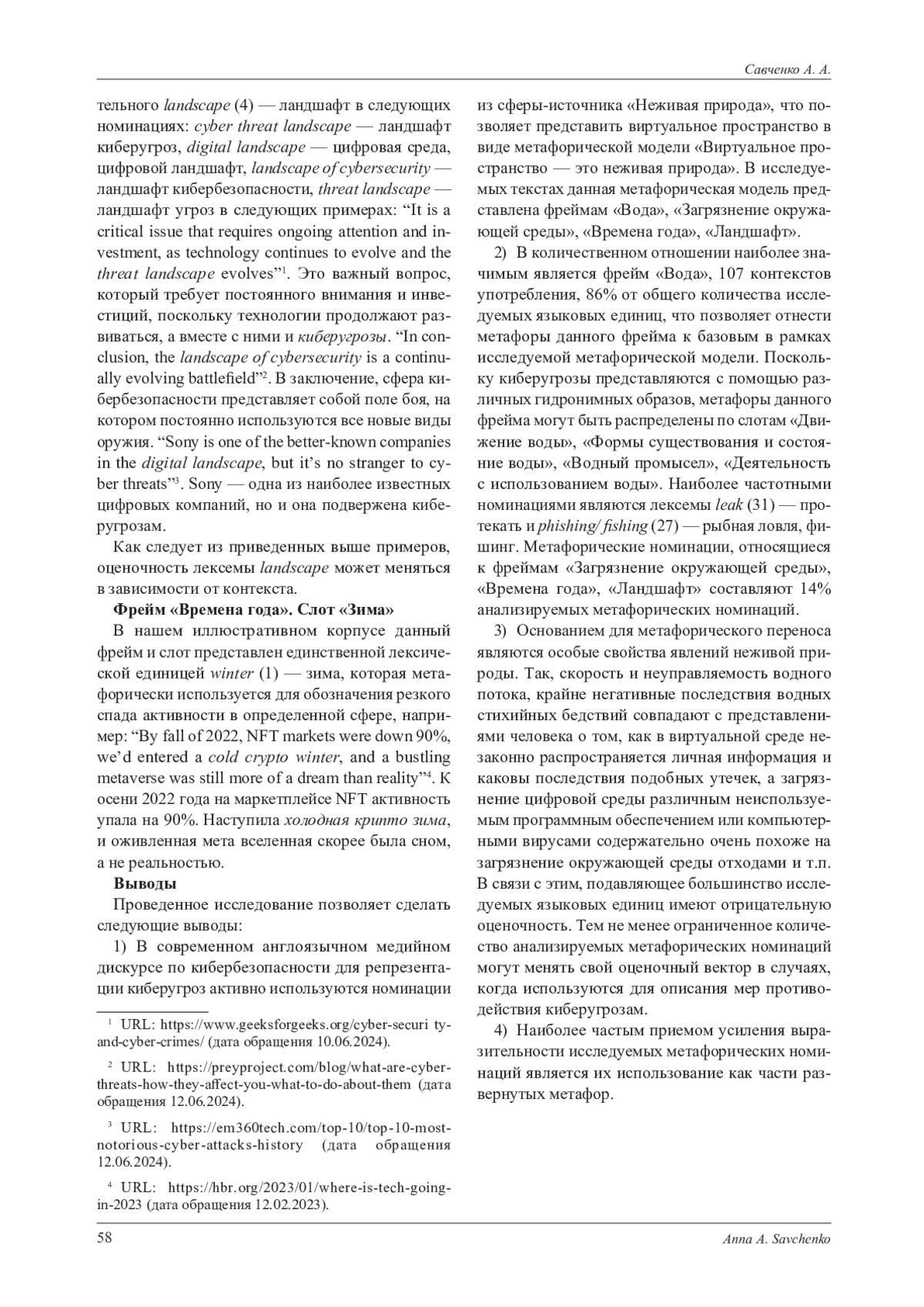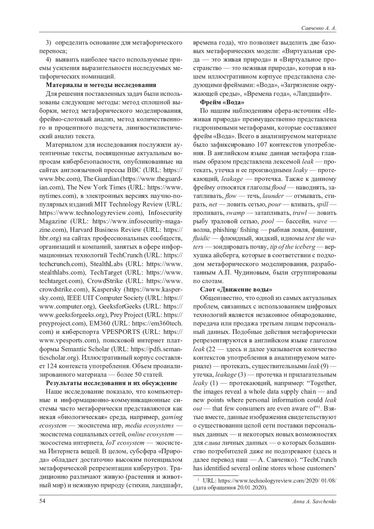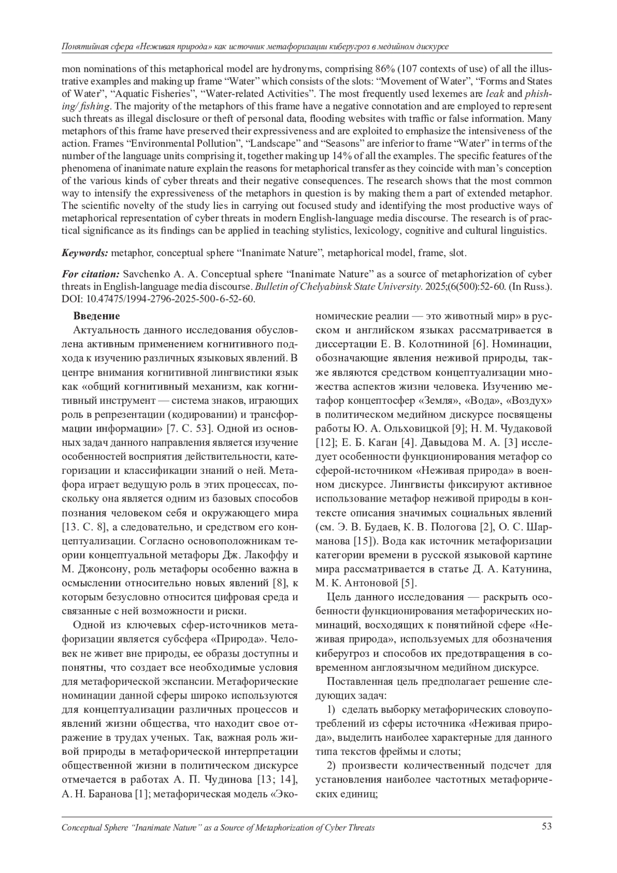 Статья посвящена метафорическим номинациям, восходящим к понятийной сфере «Неживая природа», используемым как средство репрезентации киберугроз в современном англоязычном медийном дискурсе. В результате установлено, что киберпространство может быть представлено в виде метафорической модели «Виртуальная среда это неживая природа», которая в исследуемых текстах включает в себя фреймы «Вода», «Загрязнение окружающей среды», «Времена года», «Ландшафт». Наиболее частотными номинациями данной метафорической модели являются гидронимные метафоры. Фрейм «Вода» составляют 86% исследуемых языковых единиц, 107 контекстов употребления, которые распределяются по слотам «Движение воды», «Формы существования и состояние воды», «Водный промысел», «Деятельность с использованием воды». Наиболее частотными номинациями являются лексемы leak - протекать и phishing/ fishing - рыбная ловля, фишинг. Подавляющее большинство метафор данного фрейма имеют отрицательную коннотацию и используются для описания таких актуальных угроз как незаконное обнародование/завладение личными данными, наводнение сайтов трафиком или недостоверной информацией. Многие из метафорических номинаций данного фрейма не утратили своей образности и указывают на высокую интенсивность действия. Фреймы «Загрязнение окружающей среды», «Ландшафт», «Времена года» в количественном отношении значительно уступают фрейму «Вода» и в совокупности составляют 14% от общего числа исследуемых языковых единиц. Основанием для метафорического переноса являются особые свойства явлений неживой природы, которые в содержательном плане совпадают с представлениями человека о различных типах киберугроз и их негативных последствиях. Наиболее частым приемом усиления выразительности метафорических номинаций в анализируемых текстах является их использование в развернутых метафорах. Научная новизна работы заключается в целенаправленном исследовании метафор из сферы-источника «Неживая природа», функционирующих в современном англоязычном медийном дискурсе по кибербезопасности. Данное исследование имеет практическую значимость, поскольку его результаты могут быть использованы в преподавании таких дисциплин как стилистика, лексикология, когнитивная лингвистика, лингвокультурология.