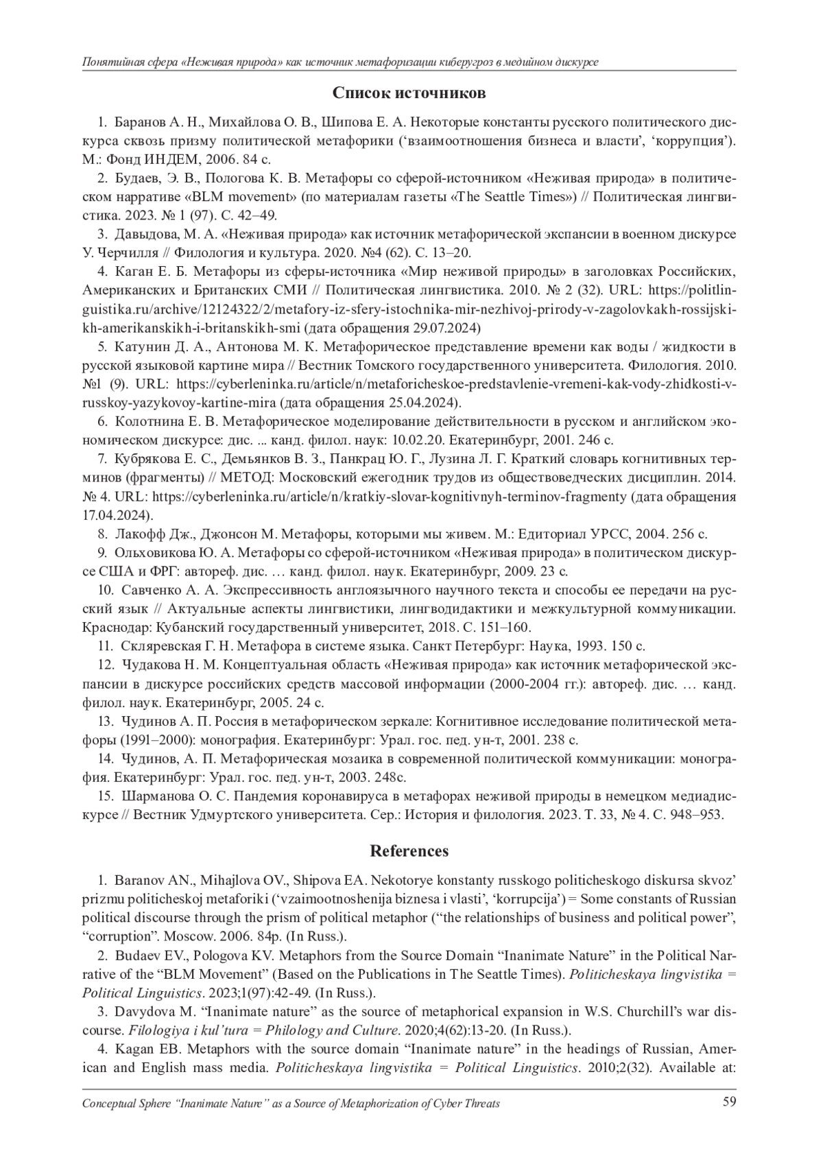 3. Давыдова, М. А. “Неживая природа” как источник метафорической экспансии в военном дискурсе У. Черчилля // Филология и культура. 2020. №4 (62). С. 13-20.
