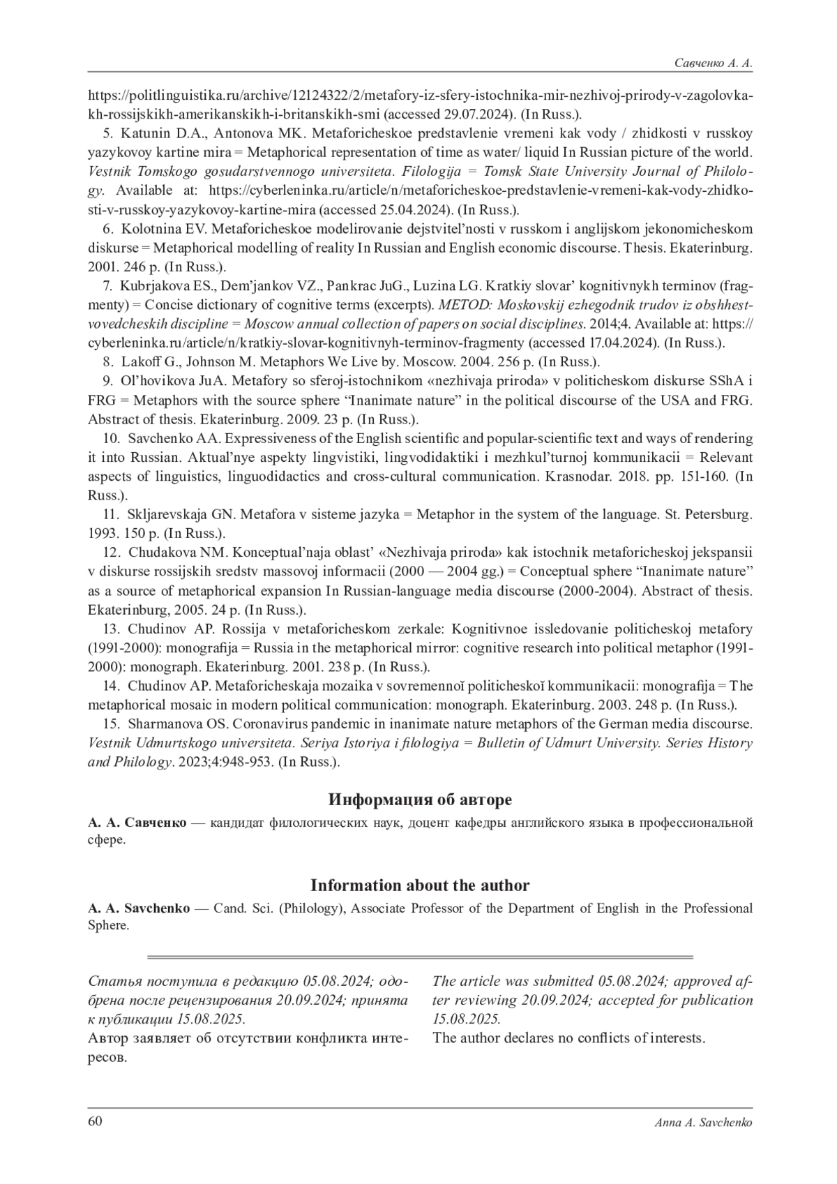 10. Савченко А. А. Экспрессивность англоязычного научного текста и способы ее передачи на русский язык // Актуальные аспекты лингвистики, лингводидактики и межкультурной коммуникации. Краснодар: Кубанский государственный университет, 2018. С. 151-160. EDN: XWTDPV