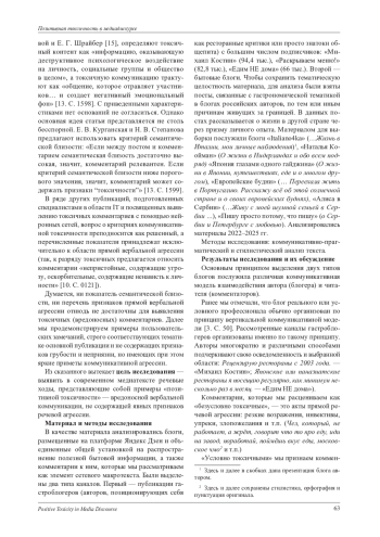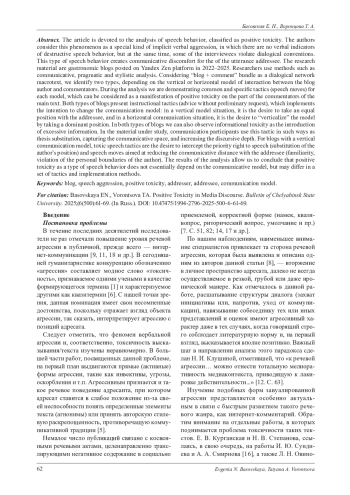 Статья посвящена анализу речевого поведения, которое можно квалифицировать как позитивную токсичность. Позитивная токсичность рассматривается авторами как особая разновидность имплицитной речевой агрессии, при которой отсутствуют вербальные показатели деструктивного речевого поведения, но при этом нарушаются диалогические конвенции. Такой тип речевого поведения создает коммуникативный дискомфорт для адресата высказывания. Материалом исследования послужили размещенные на платформе Яндекс Дзен в 2022-2025 г. блоги, посвященные гастрономической теме. В процессе исследования были использованы методы коммуникативно-прагматического и стилистического анализа. Поскольку связка «блог + комментарий» рассматривается как диалогический сетевой макротекст, было выделено два типа блогов в зависимости от вертикальной или горизонтальной модели взаимодействия автора блога и комментаторов. В ходе анализа были выявлены общие и специфичные для каждой модели тактики (речевые ходы), которые можно рассматривать как проявление позитивной токсичности со стороны комментаторов основного текста. В обоих типах блогов представлена инструктивная тактика (совет без запроса), которая реализует интенцию к изменению коммуникативной модели: в ситуации вертикальной модели - это стремление занять равную с адресантом позицию, а в ситуации горизонтальной коммуникации - стремление «вертикализовать» модель, заняв доминирующую позицию. Информационная токсичность как введение избыточной информации также наблюдается в обоих типах блогов. В исследуемом материале данная тактика реализуется такими способами, как подмена тезиса, захват коммуникативного пространства, увеличение дискурсивной глубины. Для блогов с вертикальной коммуникативной моделью «токсичными» речевыми тактиками являются стремление перехватить приоритетное право на речь (подмена позиции автора) и речевые ходы, направленные на сокращение коммуникативной дистанции с адресантом (фамильярность, нарушение личных границ автора). Результаты анализа позволяют сделать вывод о том, что позитивная токсичность как разновидность речевого поведения не зависит от коммуникативной модели, но может отличаться набором тактик и способом их реализации.
