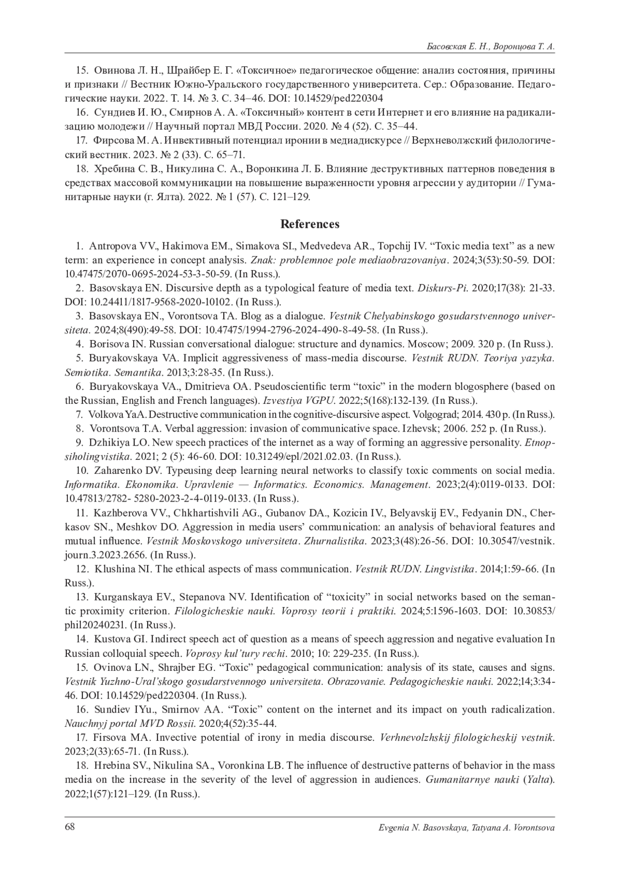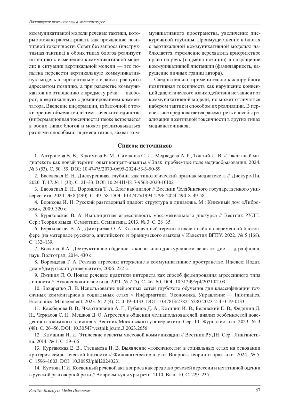 1. Антропова В. В., Хакимова Е. М., Симакова С. И., Медведева А. Р., Топчий И. В. “Токсичный медиатекст” как новый термин: опыт концепт-анализа // Знак: проблемное поле медиаобразования. 2024. № 3 (53). С. 50-59. DOI: 10.47475/2070-0695-2024-53-3-50-59 EDN: YYSUCE