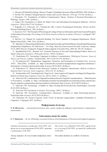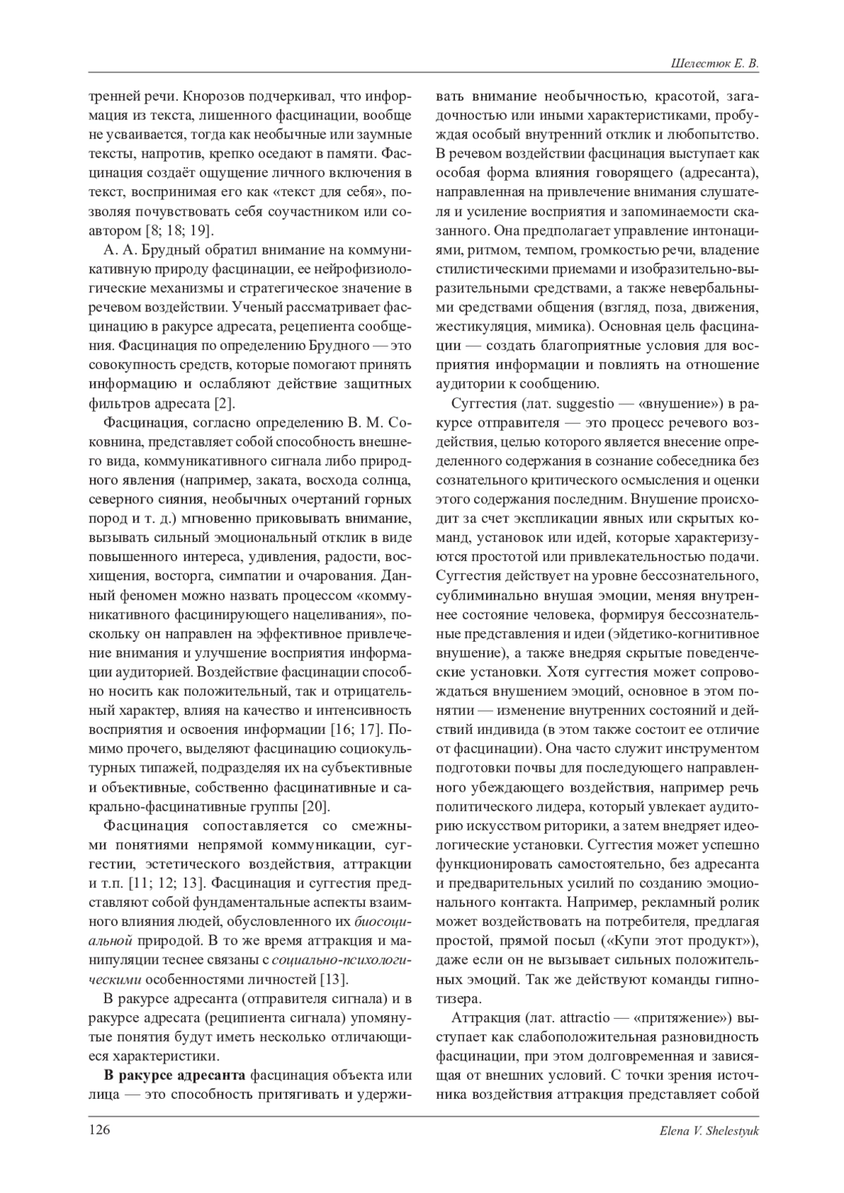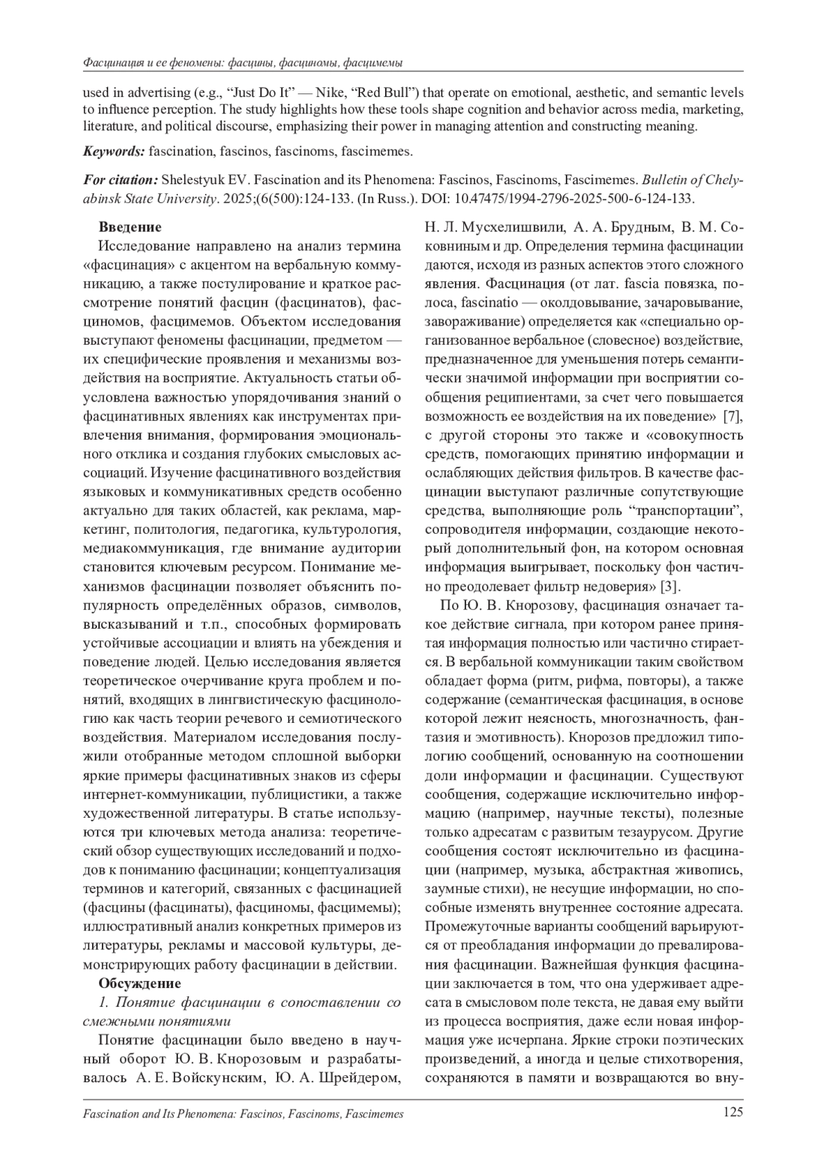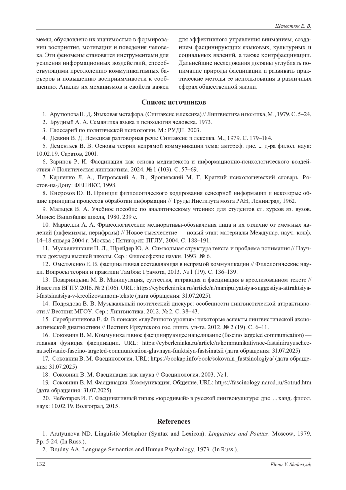 6. Зарипов Р. И. Фасцинация как основа медиатекста и информационно-психологического воздействия // Политическая лингвистика. 2024. № 1 (103). С. 57-69. EDN: OYHWMV
