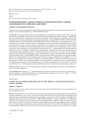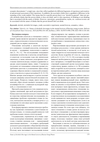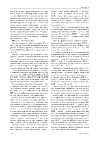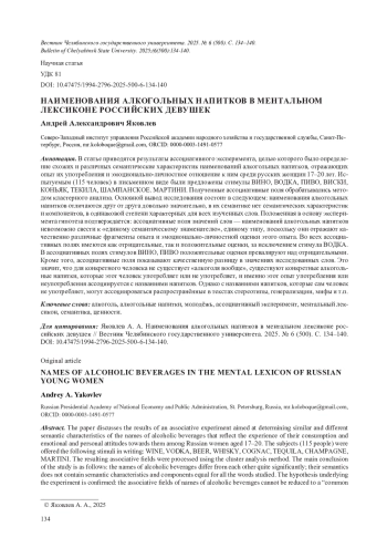 В статье приводятся результаты ассоциативного эксперимента, целью которого было определение схожих и различных семантические характеристик наименований алкогольных напитков, отражающих опыт их употребления и эмоционально-личностное отношение к ним среди русских женщин 17-20 лет. Испытуемым (115 человек) в письменном виде были предложены стимулы ВИНО, ВОДКА, ПИВО, ВИСКИ, КОНЬЯК, ТЕКИЛА, ШАМПАНСКОЕ. МАРТИНИ. Полученные ассоциативные поля обрабатывались методом кластерного анализа. Основной вывод исследования состоит в следующем: наименования алкогольных напитков отличаются друг от друга довольно значительно, в их семантике нет семантических характеристик и компонентов, в одинаковой степени характерных для всех изученных слов. Положенная в основу эксперимента гипотеза подтверждается: ассоциативные поля значений слов - наименований алкогольных напитков невозможно свести к «единому семантическому знаменателю», единому типу, поскольку они отражают качественно различные фрагменты опыта и эмоционально-личностной оценки этого опыта. Во всех ассоциативных полях имеются как отрицательные, так и положительные оценки, за исключением стимула ВОДКА. В ассоциативных полях стимулов ВИНО, ПИВО положительные оценки превалируют над отрицательными. Кроме того, ассоциативные поля показывают качественную разницу в значениях исследованных слов. Это значит, что для конкретного человека не существует «алкоголя вообще», существуют конкретные алкогольные напитки, которые этот человек употребляет или не употребляет, и именно этот опыт употребления или неупотребления ассоциируется с названиями напитков. Однако с названиями напитков, которые сам человек не употребляет, могут ассоциироваться распространённые в текстах стереотипы, генерализации, мифы и т. п.
