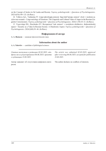3. Волкова Я. А., Вашунина И. В. Лингвоаксиология эмоций: лингвокультурная ценность злости в русском языковом сознании // Вопросы психолингвистики. 2024. № 1 (59). С. 10-21. EDN: NHJOCL