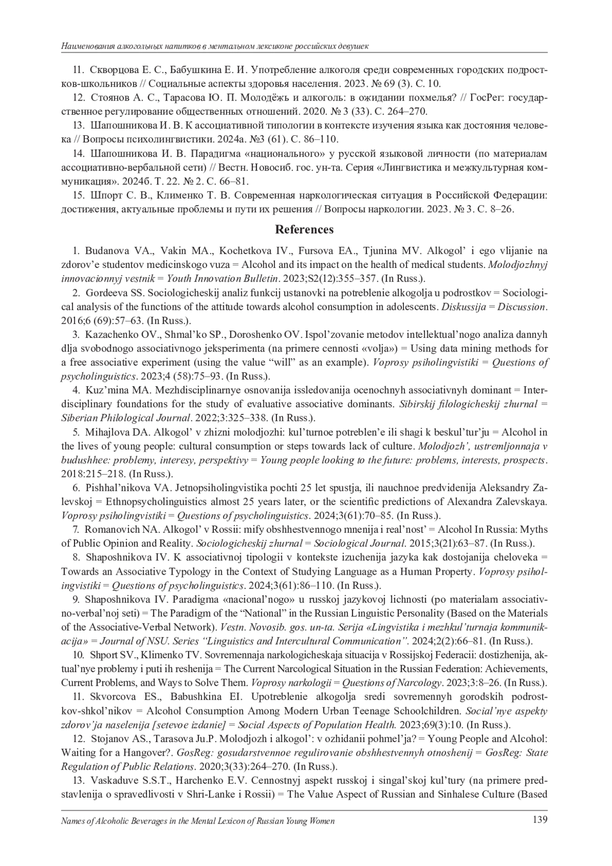 11. Скворцова Е. С., Бабушкина Е. И. Употребление алкоголя среди современных городских подростков-школьников // Социальные аспекты здоровья населения. 2023. № 69 (3). С. 10. EDN: LBTZIB