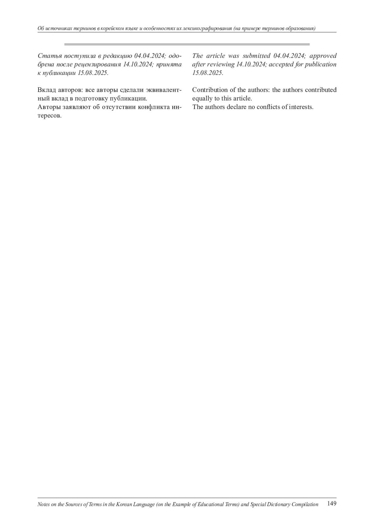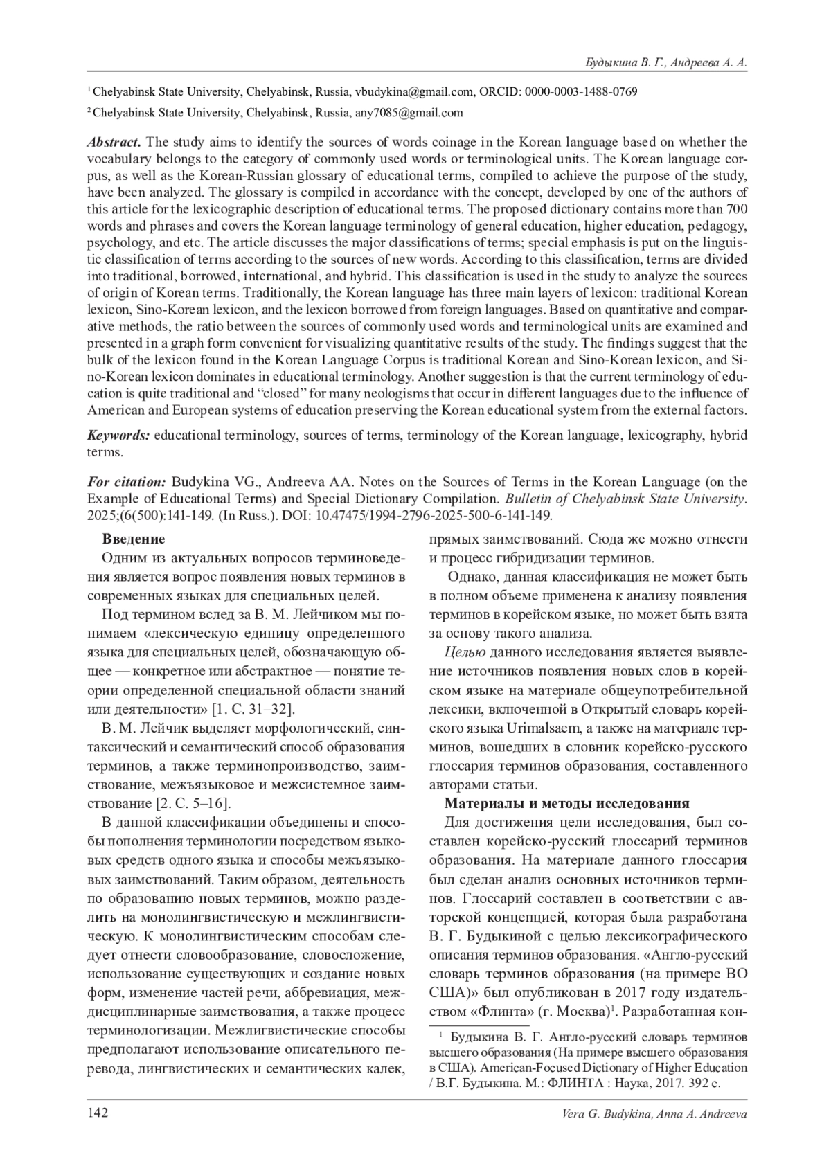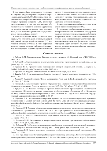 Статья посвящена анализу источников появления новых слов в корейском языке. Анализ выполнен на материале Открытого словаря корейского языка Urimalsaem, а также корейско-русского глоссария терминов образования, насчитывающего 700 терминов и составленного авторами для достижения цели исследования. Глоссарий составлен в соответствии с концепцией лексикографического описания учебных терминов, разработанной одним из авторов настоящей статьи. Предлагаемый словарь охватывает корейскоязычную терминологию общего и высшего образования, педагогики и психологии. В статье рассматриваются основные классификации терминов по источникам появления новых слов. Корейский язык имеет три основных слоя лексики: традиционную корейскую лексику, китайско-корейскую лексику и лексику, заимствованную из других иностранных языков. На основе количественного и сравнительного методов исследовано соотношение источников общеупотребительных слов и терминологических единиц. Результаты представлены в графической форме, удобной для визуализации количественных результатов исследования. Результаты показывают, что основную долю лексики, входящей в Открытый словарь корейского языка, составляет исконно-корейская и сино-корейская лексика, а также термины-гибриды, образованные по следующим моделям: сино-китайский элемент + заимствование из иностранного языка; сино-китайский элемент + исконно-корейский элемент; термины-гибриды (заимствование из иностранного языка + исконно-корейский элемент/сино-корейский элемент). Что касается терминологии образования, в ней доминирует китайско-корейская лексика. Другое предположение состоит в том, что современная корейская терминология образования достаточно традиционна, «закрыта» для многих неологизмов, которые появляются в терминосистемах образования многих других языков как результат влияния американской и европейской систем образования. Предположение основано на том, что количество слов-гибридов в корейской терминологии образования почти в 2,5 раза ниже, чем количество слов-гибридов в общеупотребительной лексике, входящей в Открытый словарь корейского языка и образованной по той же словообразовательной модели.