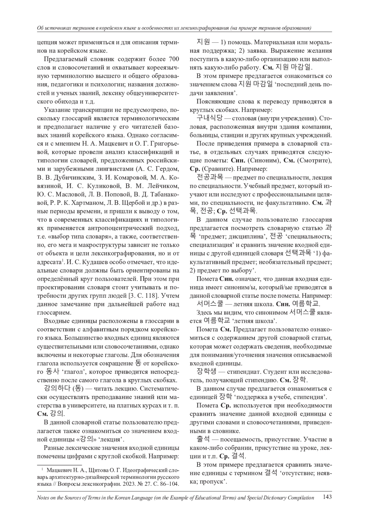 Указание транскрипции не предусмотрено, поскольку глоссарий является терминологическим и предполагает наличие у его читателей базовых знаний корейского языка. Однако согласимся и с мнением Н. А. Мацкевич и О. Г. Григорьевой, которые провели анализ классификаций и типологии словарей, предложенных российскими и зарубежными лингвистами (А. С. Гердом, В. В. Дубичинским, З. И. Комаровой, М. А. Ковязиной, И. С. Куликовой, В. М. Лейчиком, Ю. С. Масловой, Л. В. Поповой, В. Д. Табанаковой, Р. Р. К. Хартманом, Л. В. Щербой и др.) в разные периоды времени, и пришли к выводу о том, что в современных классификациях и типологиях применяется антропоцентрический подход, т. е. «выбор типа словаря», а также, соответственно, его мега и макроструктуры зависит не только от объекта и цели лексикографирования, но и от адресата.