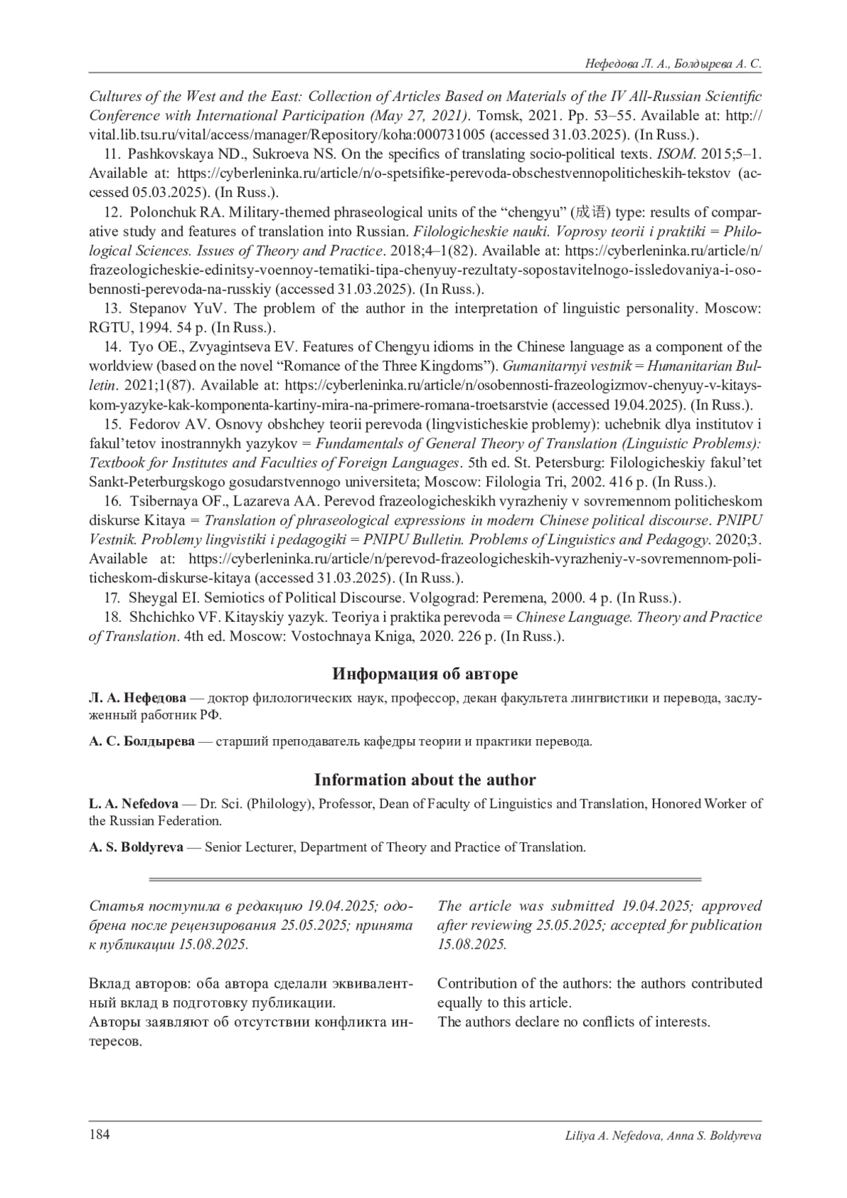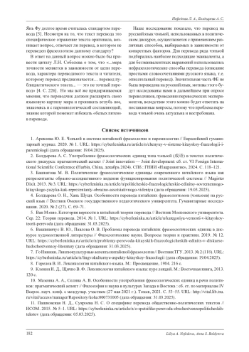 16. Циберная О. Ф., Лазарева А. А. Перевод фразеологических выражений в современном политическом дискурсе Китая // Вестник ПНИПУ. Проблемы языкознания и педагогики. 2020. № 3. URL: https://cyberleninka.ru/article/n/perevod-fra/eologicheskih-vyra/heniy-v-sovremennom-politicheskom-diskurse-kitaya (дата обращения: 31.03.2025). EDN: UTMLQV