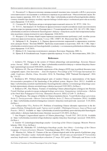 4. Болдырева О. Н., Хань Шуци. Особенности перевода китайских фразеологизмов (чэнъюев) на русский язык // Вестник Омского государственного педагогического университета. Гуманитарные исследования. 2020. № 2 (27). С. 69-71. EDN: IBNMKL