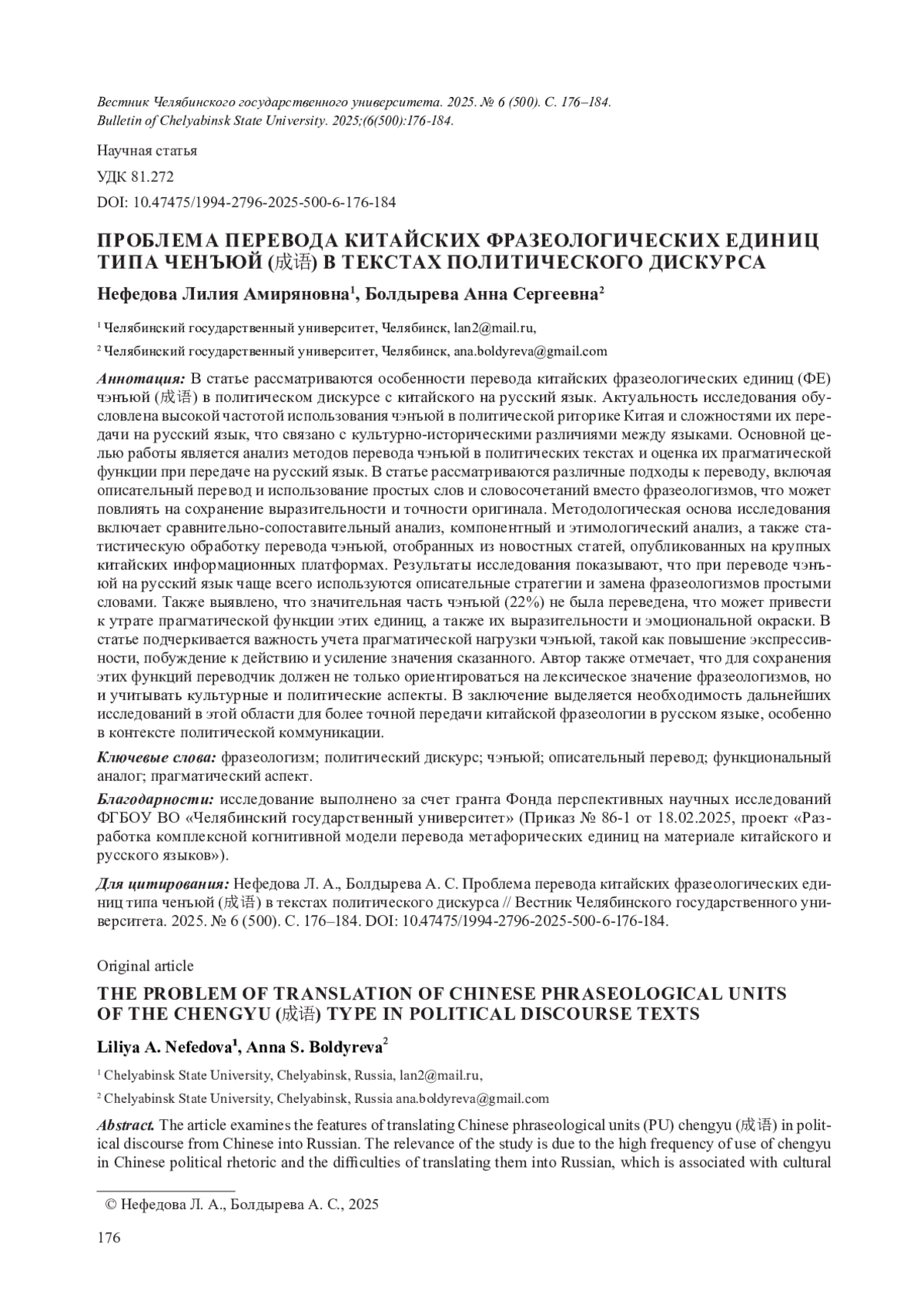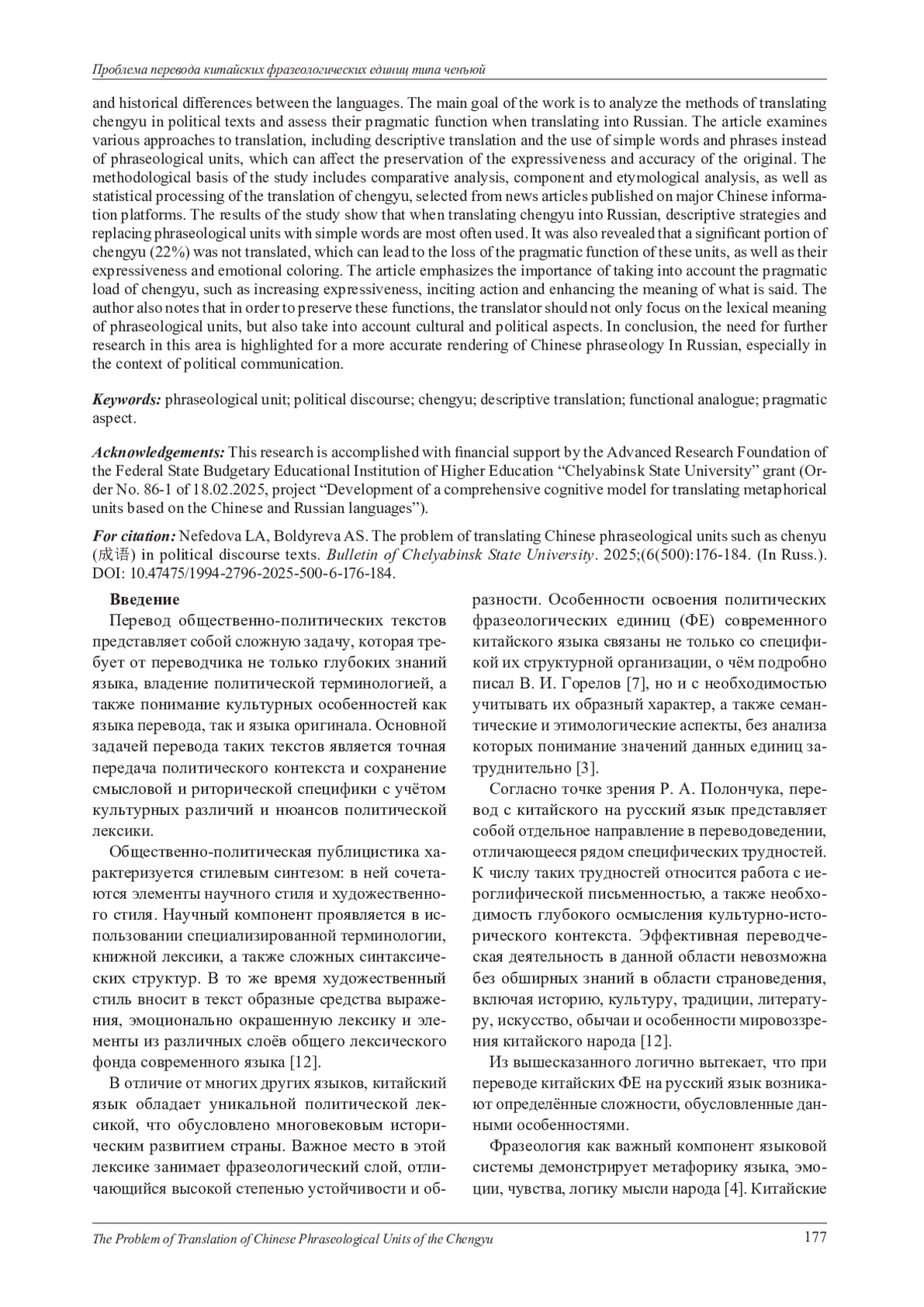 В статье рассматриваются особенности перевода китайских фразеологических единиц (ФЕ) чэнъюй (成语) в политическом дискурсе с китайского на русский язык. Актуальность исследования обусловлена высокой частотой использования чэнъюй в политической риторике Китая и сложностями их передачи на русский язык, что связано с культурно-историческими различиями между языками. Основной целью работы является анализ методов перевода чэнъюй в политических текстах и оценка их прагматической функции при передаче на русский язык. В статье рассматриваются различные подходы к переводу, включая описательный перевод и использование простых слов и словосочетаний вместо фразеологизмов, что может повлиять на сохранение выразительности и точности оригинала. Методологическая основа исследования включает сравнительно-сопоставительный анализ, компонентный и этимологический анализ, а также статистическую обработку перевода чэнъюй, отобранных из новостных статей, опубликованных на крупных китайских информационных платформах. Результаты исследования показывают, что при переводе чэнъюй на русский язык чаще всего используются описательные стратегии и замена фразеологизмов простыми словами. Также выявлено, что значительная часть чэнъюй (22%) не была переведена, что может привести к утрате прагматической функции этих единиц, а также их выразительности и эмоциональной окраски. В статье подчеркивается важность учета прагматической нагрузки чэнъюй, такой как повышение экспрессивности, побуждение к действию и усиление значения сказанного. Автор также отмечает, что для сохранения этих функций переводчик должен не только ориентироваться на лексическое значение фразеологизмов, но и учитывать культурные и политические аспекты. В заключение выделяется необходимость дальнейших исследований в этой области для более точной передачи китайской фразеологии в русском языке, особенно в контексте политической коммуникации.