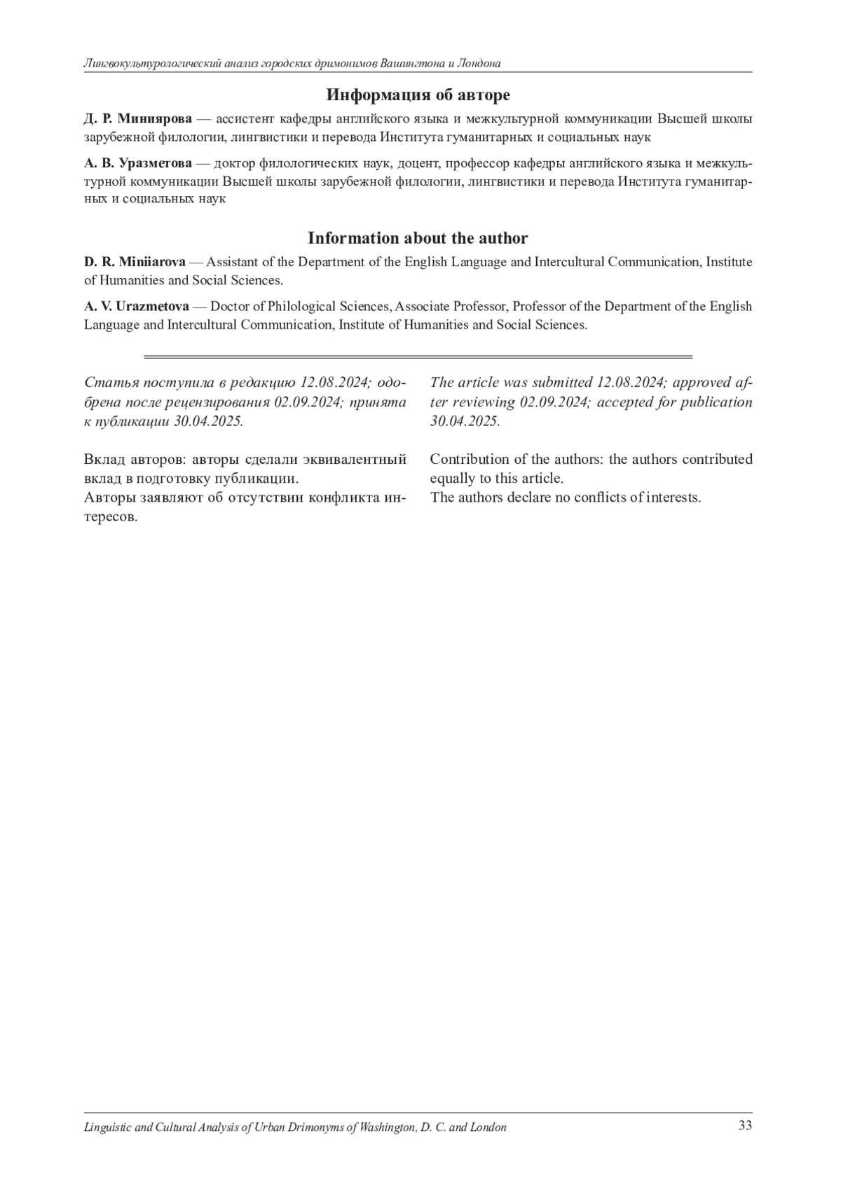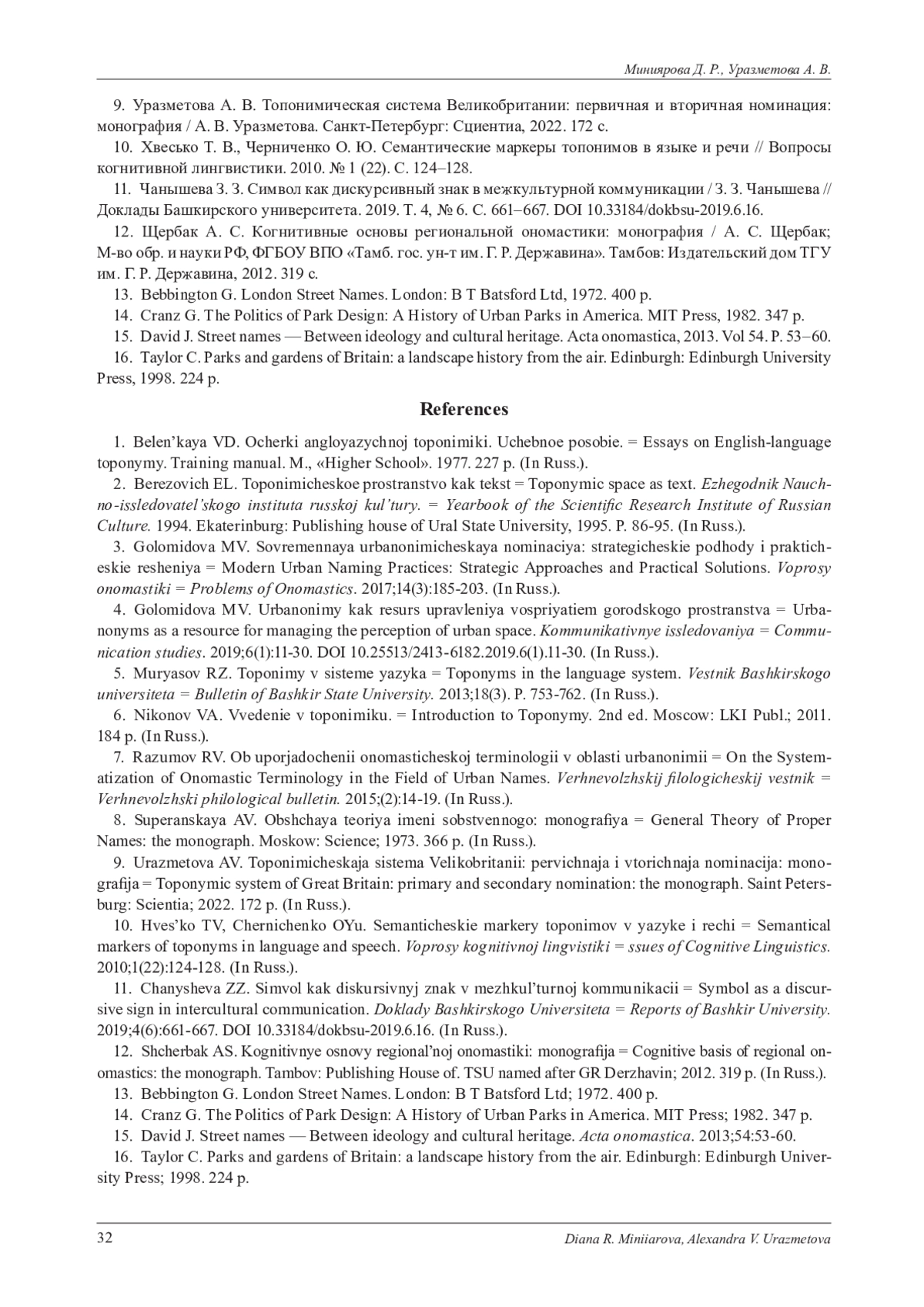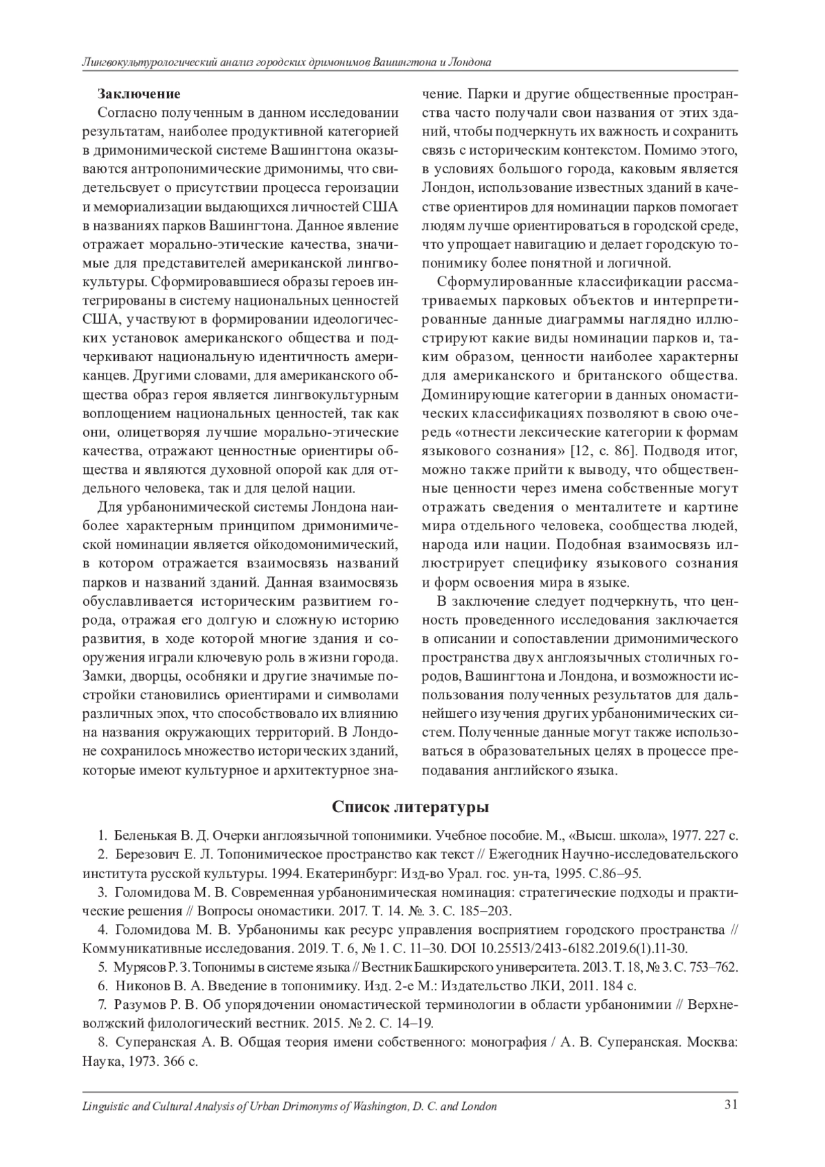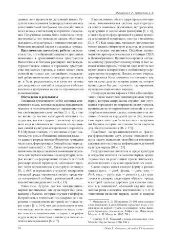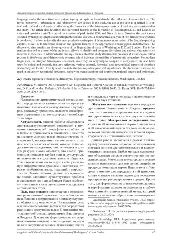 В статье представлен лингвокультурологический анализ городских дримонимов двух англоязычных столиц - Вашингтона и Лондона, с акцентом на выявление и сравнение принципов номинации парков и зеленых зон в этих столицах. Выбор городов для проводимого анализа объясняется тем, что они связанны одним языком, но при этом обладают уникальными топонимическими системами, сформировавшимися под влиянием различных факторов. В ходе исследования дается определение терминов «топоним», «урбаноним» и «дримоним», уточняется применение последнего. Рассматриваются исторические, культурные и социальные аспекты, влияющие на формирование дримонимической системы каждого города. Кроме того, описываются индивидуальные особенности формирования Вашингтона и Лондона, приводится краткая история создания парков США и Великобритании. На материале названий парков, выбранных с помощью топографических и картографических онлайн-сервисов, проводится сравнительный анализ двух дримонимических систем, который позволяет выявить наиболее продуктивные принципы дримонимической номинации исследуемых англоязычных столиц, а также определить общие и специфические черты в подходах к наименованию парков в обоих городах. Обнаруженные данные подчеркивают уникальность лингвокультурного пространства Вашингтона и Лондона. Полученная в результате исследования информация также позволяет определить и сопоставить ценностные ориентиры и национальные особенности, свойственные рассматриваемым городам. В дополнение к полученным выводам результаты исследования иллюстрируют наличие процесса трансонимизации при формировании дримонимических систем, что свидетельствует о мобильности топонимической лексики. Для современной лингвистики исследование дримонимов является актуальным, так как они не только помогают ориентироваться в пространстве, но и обладают специфическими лексико-семантическими особенностями, отражающими разнообразные культурные, исторические и географические аспекты места, где они расположены. Подобного рода исследования имеют также важное практическое значение, так как обнаруженные в результате данные могут быть реализованы в вузовских образовательных программах, а именно в лекционных занятиях и спецкурсах по страноведению и лексикологии.