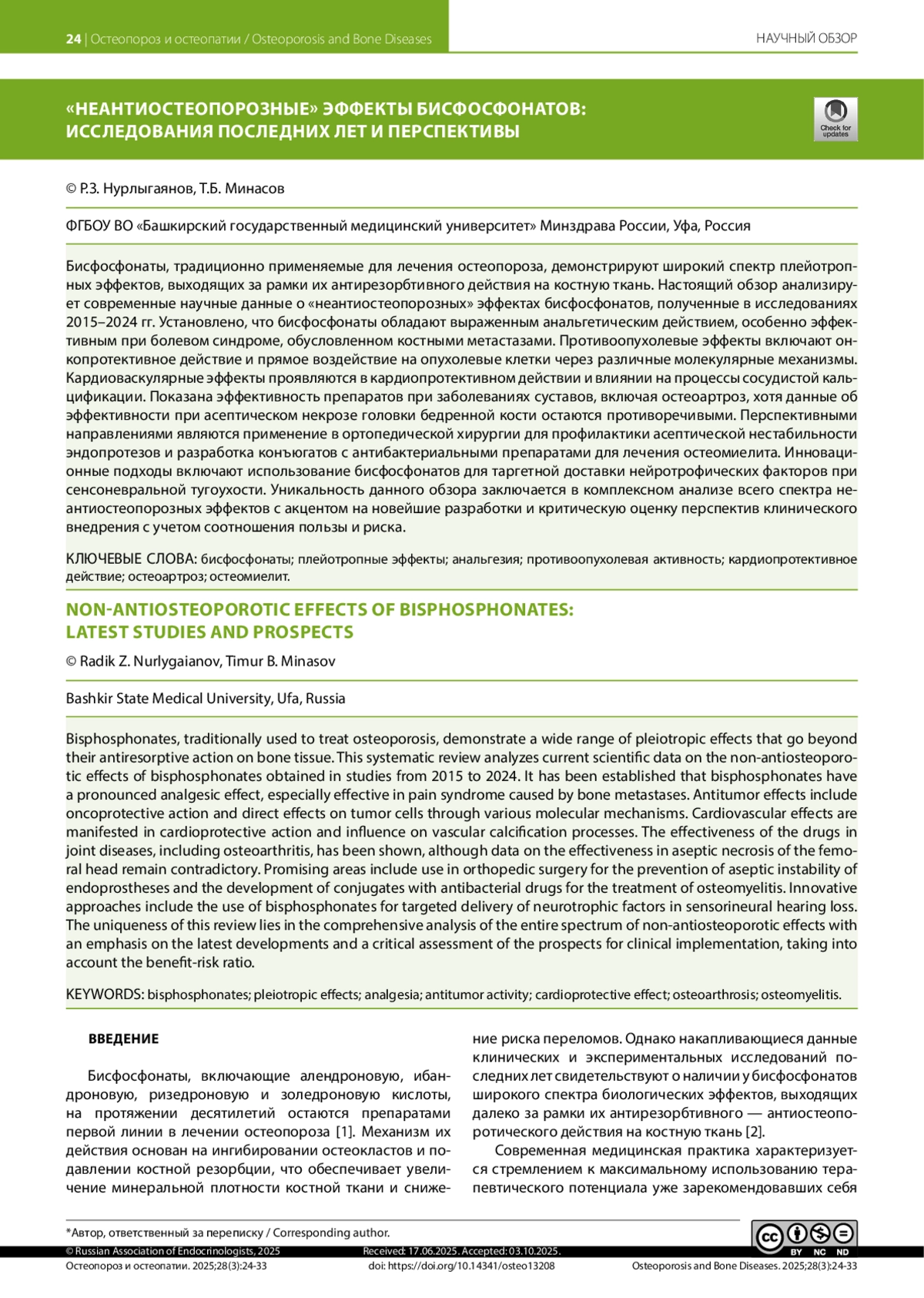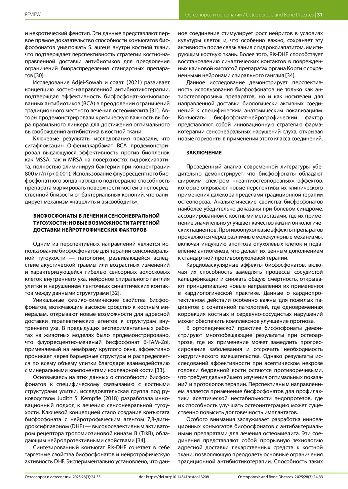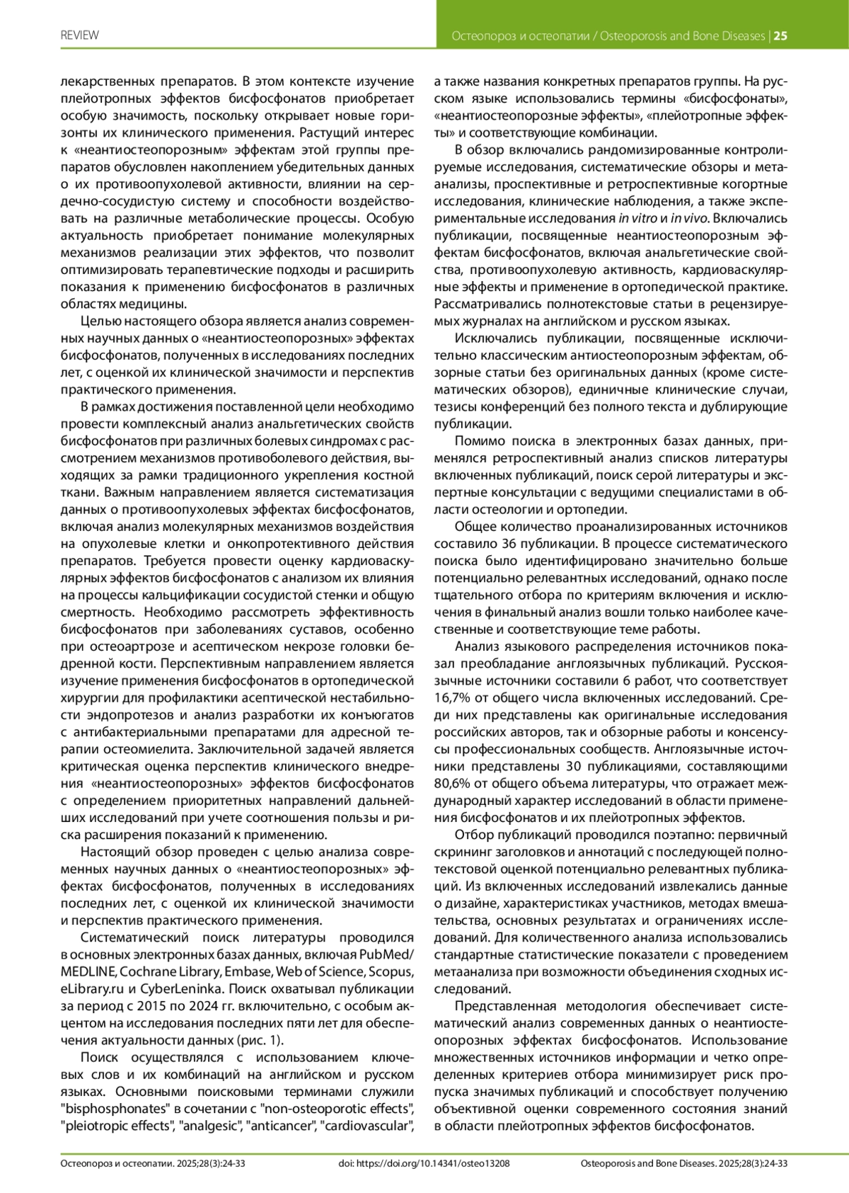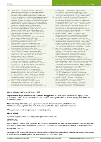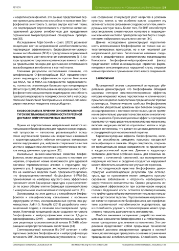 Бисфосфонаты, традиционно применяемые для лечения остеопороза, демонстрируют широкий спектр плейотропных эффектов, выходящих за рамки их антирезорбтивного действия на костную ткань. Настоящий обзор анализирует современные научные данные о «неантиостеопорозных» эффектах бисфосфонатов, полученные в исследованиях 2015–2024 гг. Установлено, что бисфосфонаты обладают выраженным анальгетическим действием, особенно эффективным при болевом синдроме, обусловленном костными метастазами. Противоопухолевые эффекты включают онкопротективное действие и прямое воздействие на опухолевые клетки через различные молекулярные механизмы. Кардиоваскулярные эффекты проявляются в кардиопротективном действии и влиянии на процессы сосудистой кальцификации. Показана эффективность препаратов при заболеваниях суставов, включая остеоартроз, хотя данные об эффективности при асептическом некрозе головки бедренной кости остаются противоречивыми. Перспективными направлениями являются применение в ортопедической хирургии для профилактики асептической нестабильности эндопротезов и разработка конъюгатов с антибактериальными препаратами для лечения остеомиелита. Инновационные подходы включают использование бисфосфонатов для таргетной доставки нейротрофических факторов при сенсоневральной тугоухости. Уникальность данного обзора заключается в комплексном анализе всего спектра неантиостеопорозных эффектов с акцентом на новейшие разработки и критическую оценку перспектив клинического внедрения с учетом соотношения пользы и риска.
