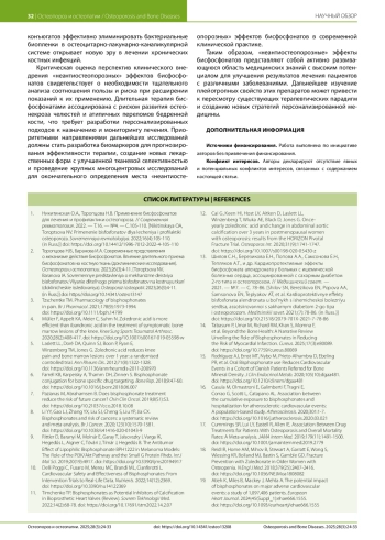 1. Никитинская О.А., Торопцова Н.В. Применение бисфосфонатов для лечения и профилактики остеопороза. // Современная ревматология. 2022. - Т.16. - №4. - С.105-110. DOI: 10.14412/1996-7012-2022-4-105-110