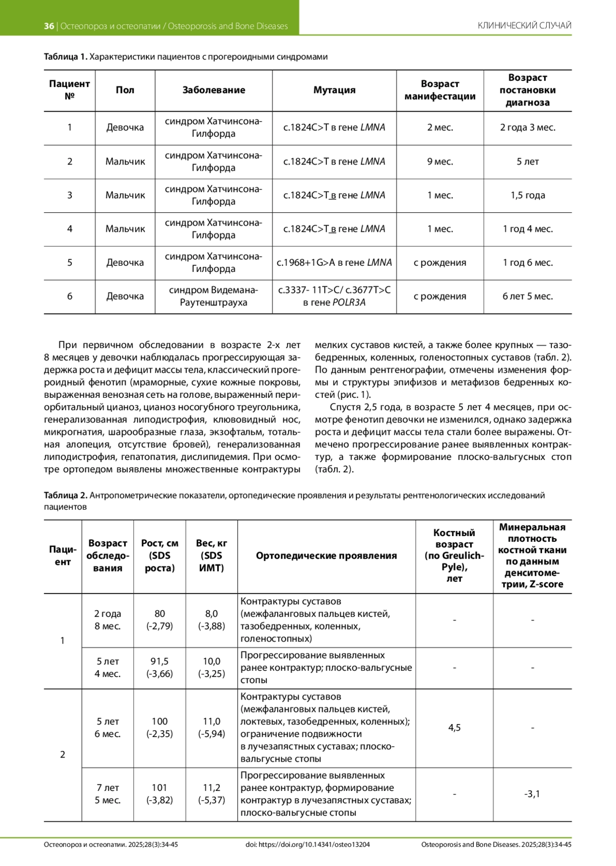 Проанализированы данные обследования 6 пациентов: 5 детей (3 мальчика и 2 девочки) с детской прогерией (синдром Хатчинсона-Гилфорда) (4 пациента с классическим генотипом детской прогерии (c.1824C>T в гене LMNA) и 1 ребенок — с неклассическим (c.1968+1G>A в гене LMNA)) и одна девочка с неонатальным прогероидным синдромом (синдром Видемана-Раутенштрауха) (c.3337- 11T>C/ c.3677T>C в гене POLR3A). Диагноз был установлен в возрасте 1,9 (1,5; 4,3) года (Ме (25%; 75%)). Пациенты находились под наблюдением врача — детского эндокринолога, осматривались врачом — травматологом-ортопедом, проводились рентгенологические исследования, денситометрия поясничного отдела позвоночника. Возраст на момент первичного обследования — 6,0 (3,5; 7,2) лет, повторного — 7,6 (7,5; 9,3) года.