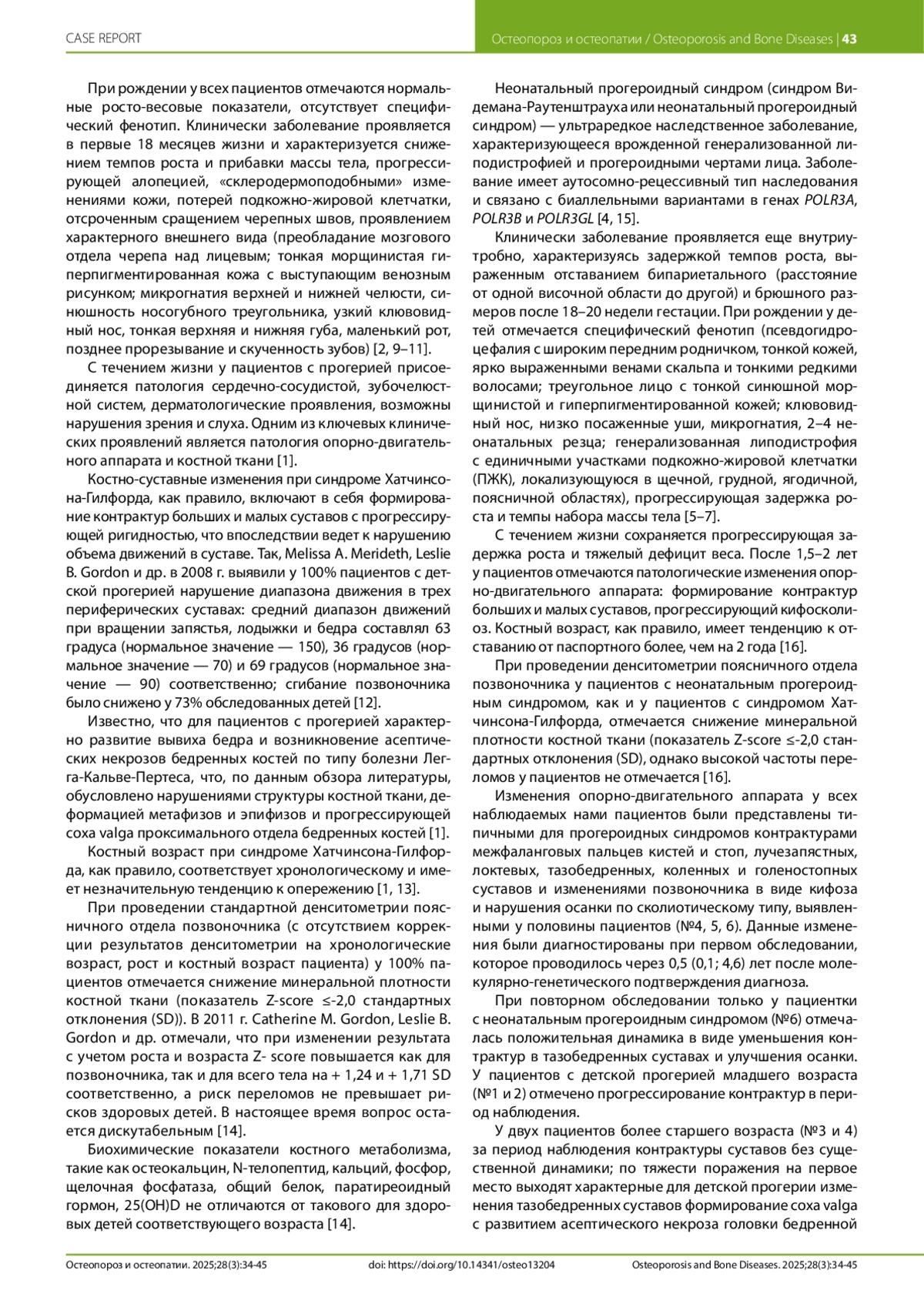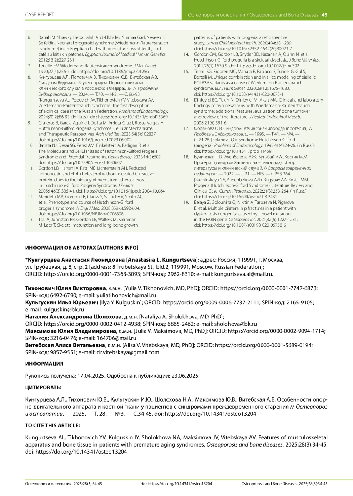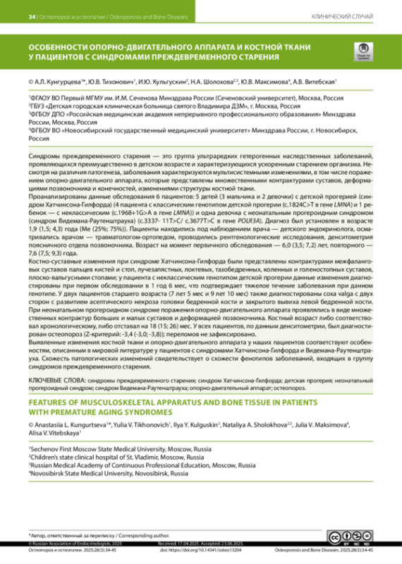 КУНГУРЦЕВА А. Л., ТИХОНОВИЧ Ю. В., КУЛЬГУСКИН И. Ю., ШОЛОХОВА Н. А., МАКСИМОВА Ю. В., ВИТЕБСКАЯ А. В. ОСОБЕННОСТИ ОПОРНО-ДВИГАТЕЛЬНОГО АППАРАТА И КОСТНОЙ ТКАНИ У ПАЦИЕНТОВ С СИНДРОМАМИ ПРЕЖДЕВРЕМЕННОГО СТАРЕНИЯ // ОСТЕОПОРОЗ И ОСТЕОПАТИИ. 2025. № 3, ТОМ 28