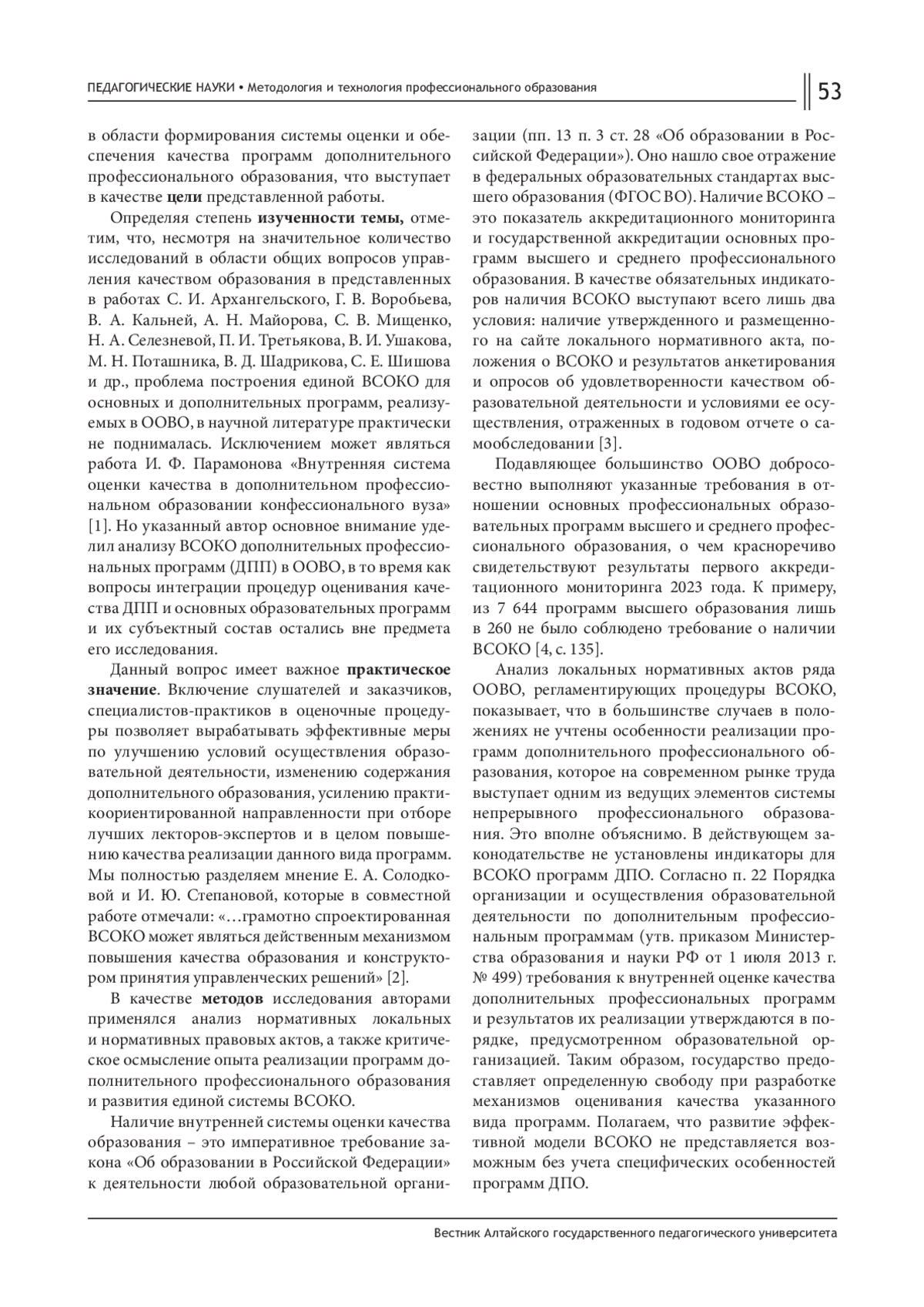 2. Солодкова Е. А., Степанова И. Ю. Оценка качества условий реализации программ дополнительного профессионального образования как механизм внутренней оценки качества образования // Научно-методическое обеспечение оценки качества образования. 2017. № 1 (2). С. 141-147. URL: https://cyberleninka.ru/article/n/otsenka-kachestva-usloviy-realizatsii-programm-dopolnitelnogo-professionalnogo-obrazovaniya-kak-mehanizm-vnutrenney-otsenki (дата обращения: 29.01.2025). EDN: ZEGVKN