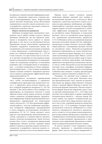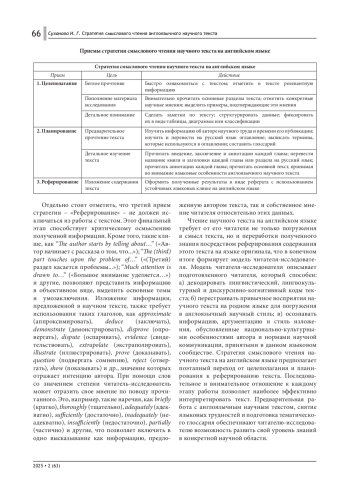 Современному исследователю необходимо изучение зарубежного опыта. Целью данной статьи является описание алгоритма работы с англоязычным научным текстом для аспирантов неязыковых направлений подготовки. Применение методов проблемного изложения и объективной герменевтики позволили разработать стратегию смыслового чтения научного текста на английском языке с учетом жанровой специфики англоязычного научного текста и его языковой репрезентации. В статье предлагается описание модели читателя-исследователя, формирование которой позволяет эффективно применять разработанную стратегию.