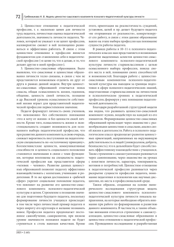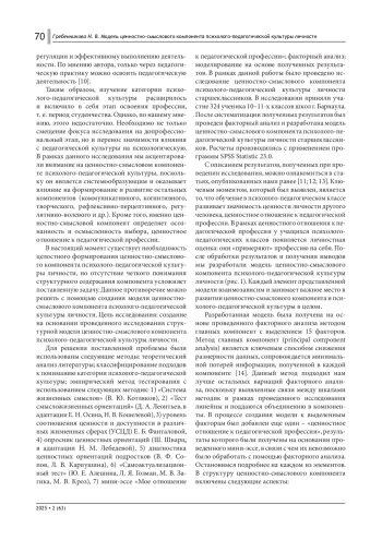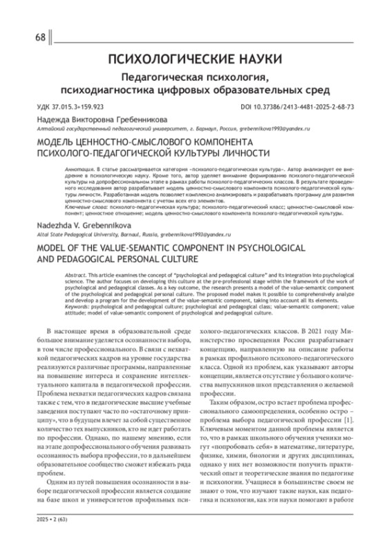 12. Гребенникова Н. В. Ценностно-смысловой компонент психолого-педагогической культуры личности старшеклассников // Russian Journal of Education and Psychology. 2023. Т. 14, № 6. С. 359-372. DOI: 10.12731/2658-4034-2023-14-6-359-372 EDN: YWSIRG