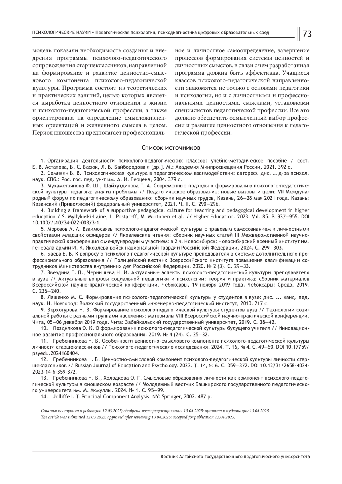 13. Гребенникова Н. В., Холодкова О. Г. Смысловые образования личности как компонент психолого-педагогической культуры в юношеском возрасте // Молодежный вестник Башкирского государственного педагогического университета им. М. Акмуллы. 2024. № 1. С. 95-99. EDN: EWJTLP