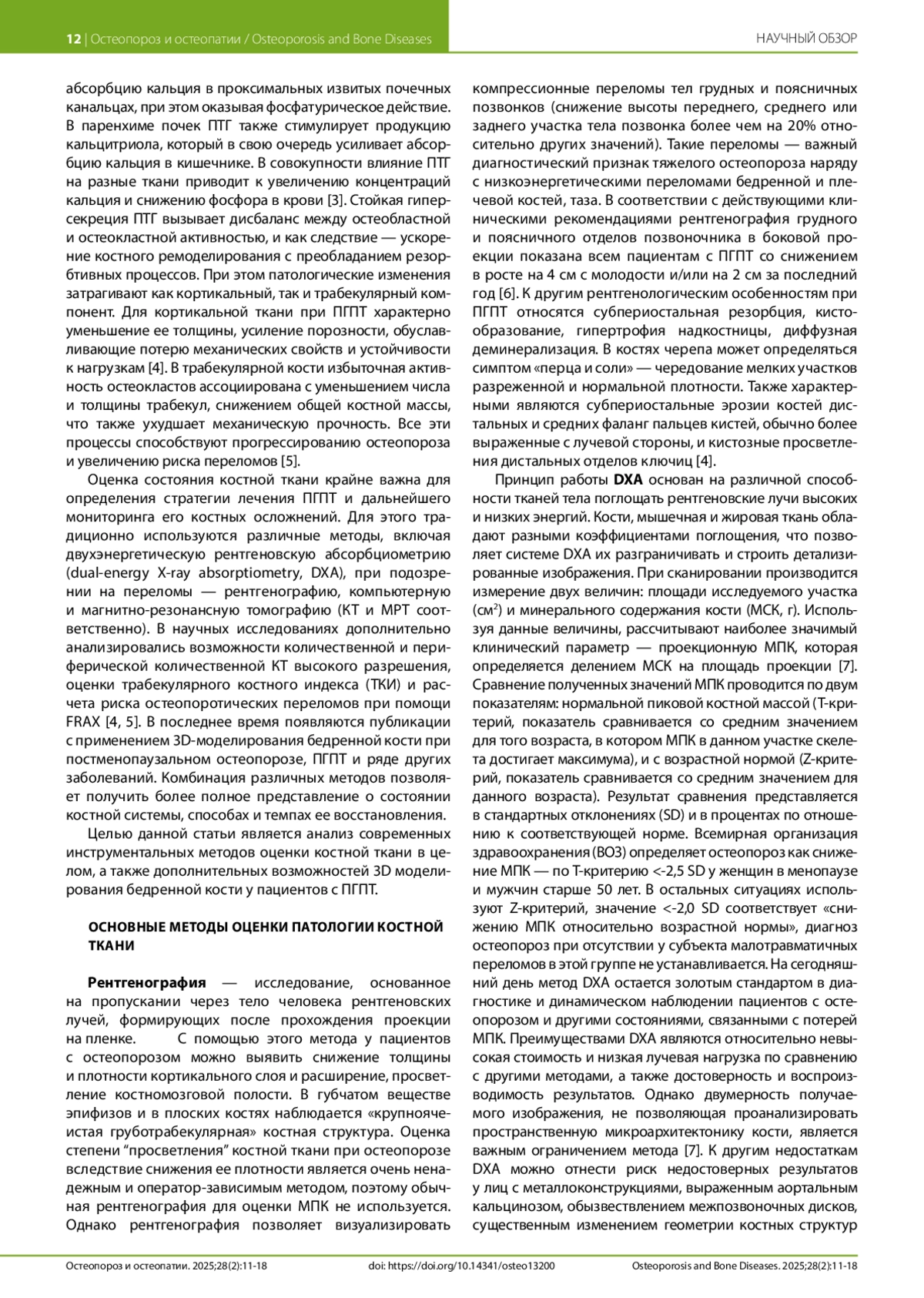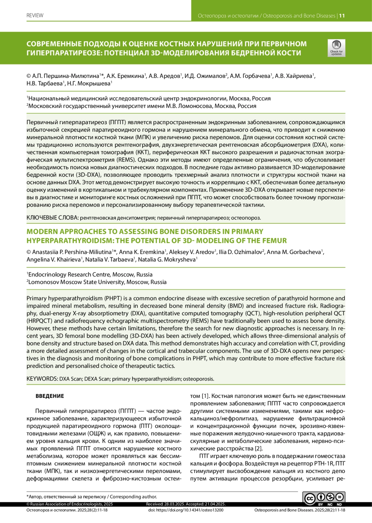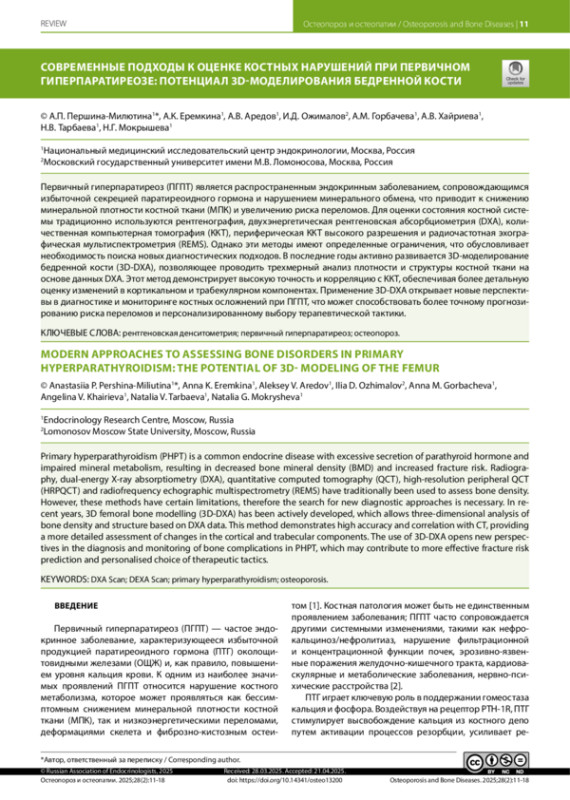 Первичный гиперпаратиреоз (ПГПТ) является распространенным эндокринным заболеванием, сопровождающимся избыточной секрецией паратиреоидного гормона и нарушением минерального обмена, что приводит к снижению минеральной плотности костной ткани (МПК) и увеличению риска переломов. Для оценки состояния костной системы традиционно используются рентгенография, двухэнергетическая рентгеновская абсорбциометрия (DXA), количественная компьютерная томография (ККТ), периферическая ККТ высокого разрешения и радиочастотная эхографическая мультиспектрометрия (REMS). Однако эти методы имеют определенные ограничения, что обусловливает необходимость поиска новых диагностических подходов. В последние годы активно развивается 3D-моделирование бедренной кости (3D-DXA), позволяющее проводить трехмерный анализ плотности и структуры костной ткани на основе данных DXA. Этот метод демонстрирует высокую точность и корреляцию с ККТ, обеспечивая более детальную оценку изменений в кортикальном и трабекулярном компонентах. Применение 3D-DXA открывает новые перспективы в диагностике и мониторинге костных осложнений при ПГПТ, что может способствовать более точному прогнозированию риска переломов и персонализированному выбору терапевтической тактики.