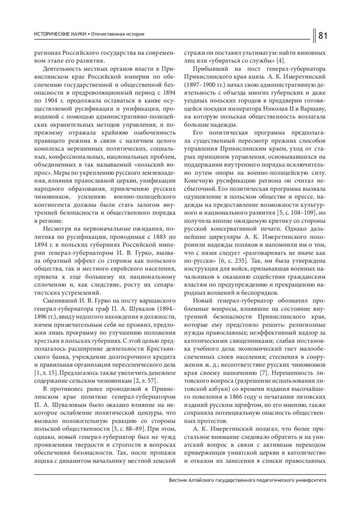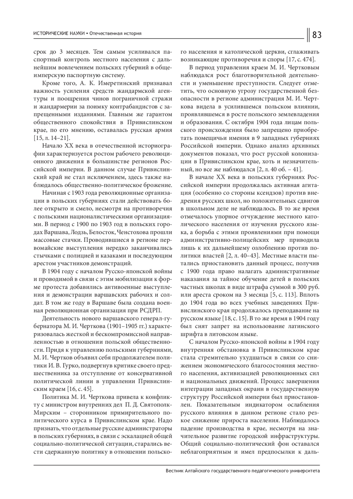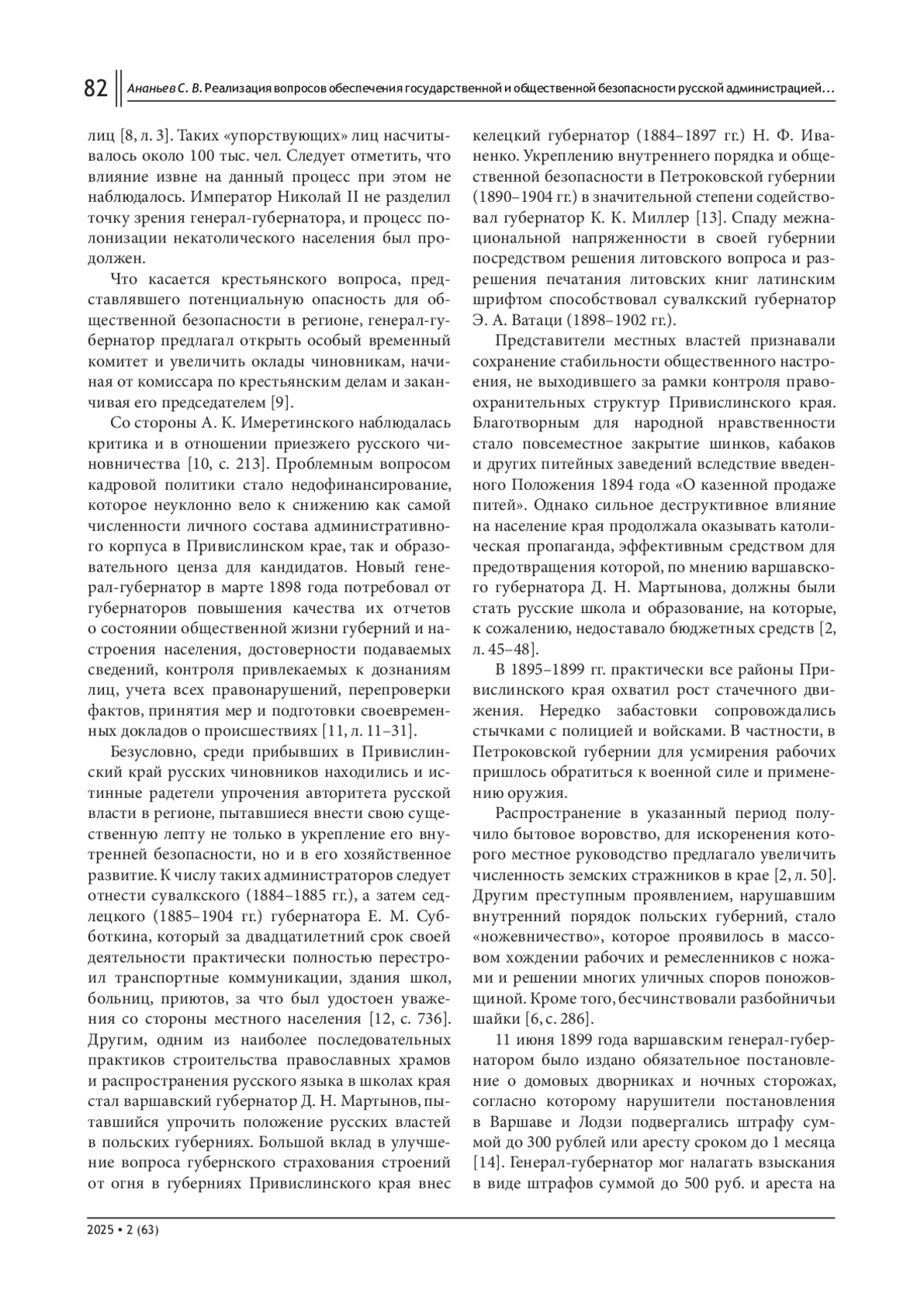 В статье рассматривается деятельность местных органов власти Привислинского края Российской империи в 1894-1904 гг. по обеспечению общественной и государственной безопасности. Дается оценка политике по предотвращению угроз внутренней безопасности, представлявших опасность в связи с существовавшими в польских губерниях империи национальным, конфессиональным, социальным и другими вопросами. В работе использованы ретроспективный, проблемно-хронологический, историко-сравнительный, а также общенаучные методы исследования.